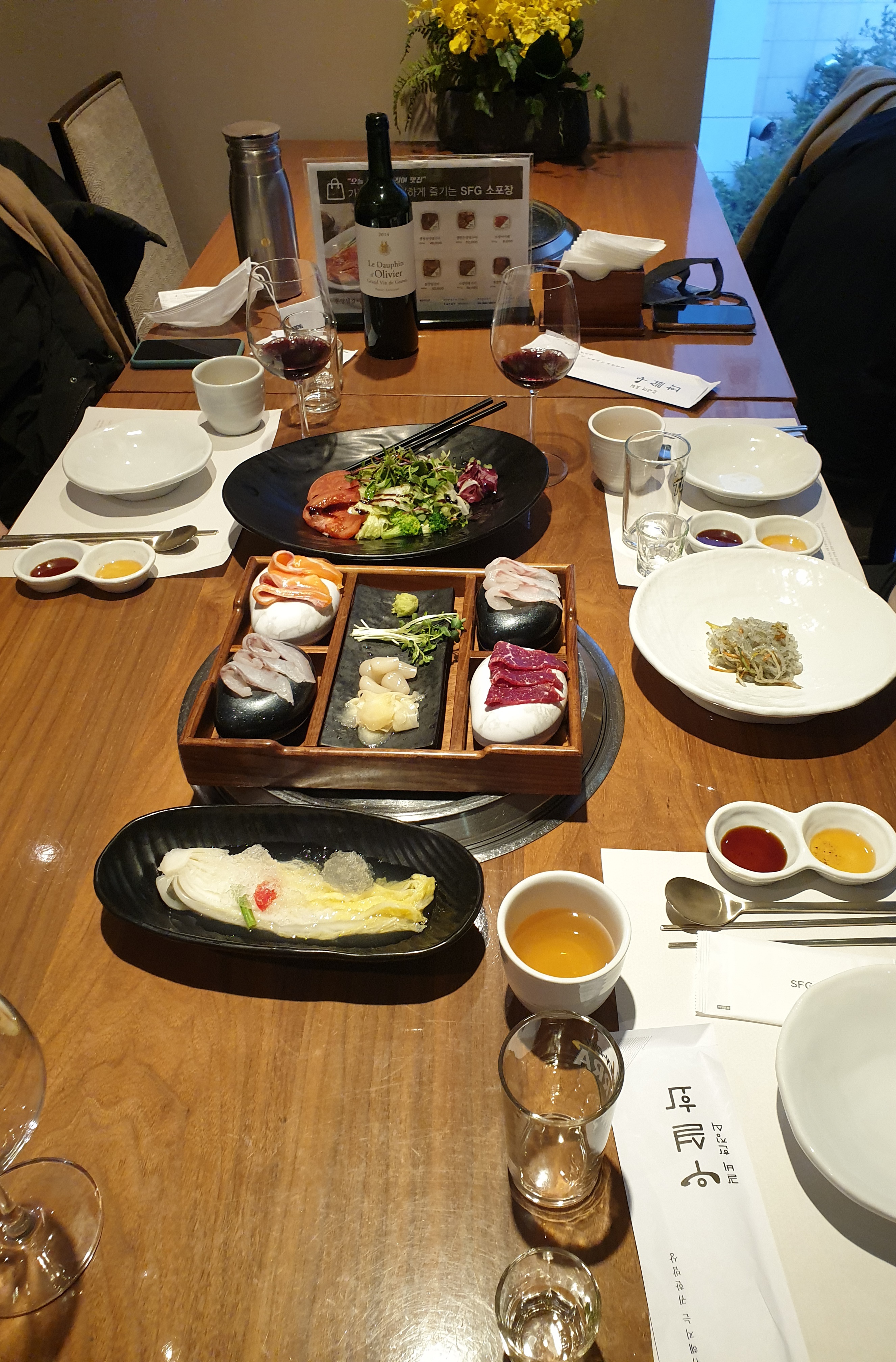 첫 셋팅때 나오는 회도 같은 건물의 일식당 긴자에서 가져온다고 했는데 싱싱하고 쫀득쫀득했으며, 육사시미도 육류 특유의 냄새도 안 나고 고소하면서 부드러웠다.