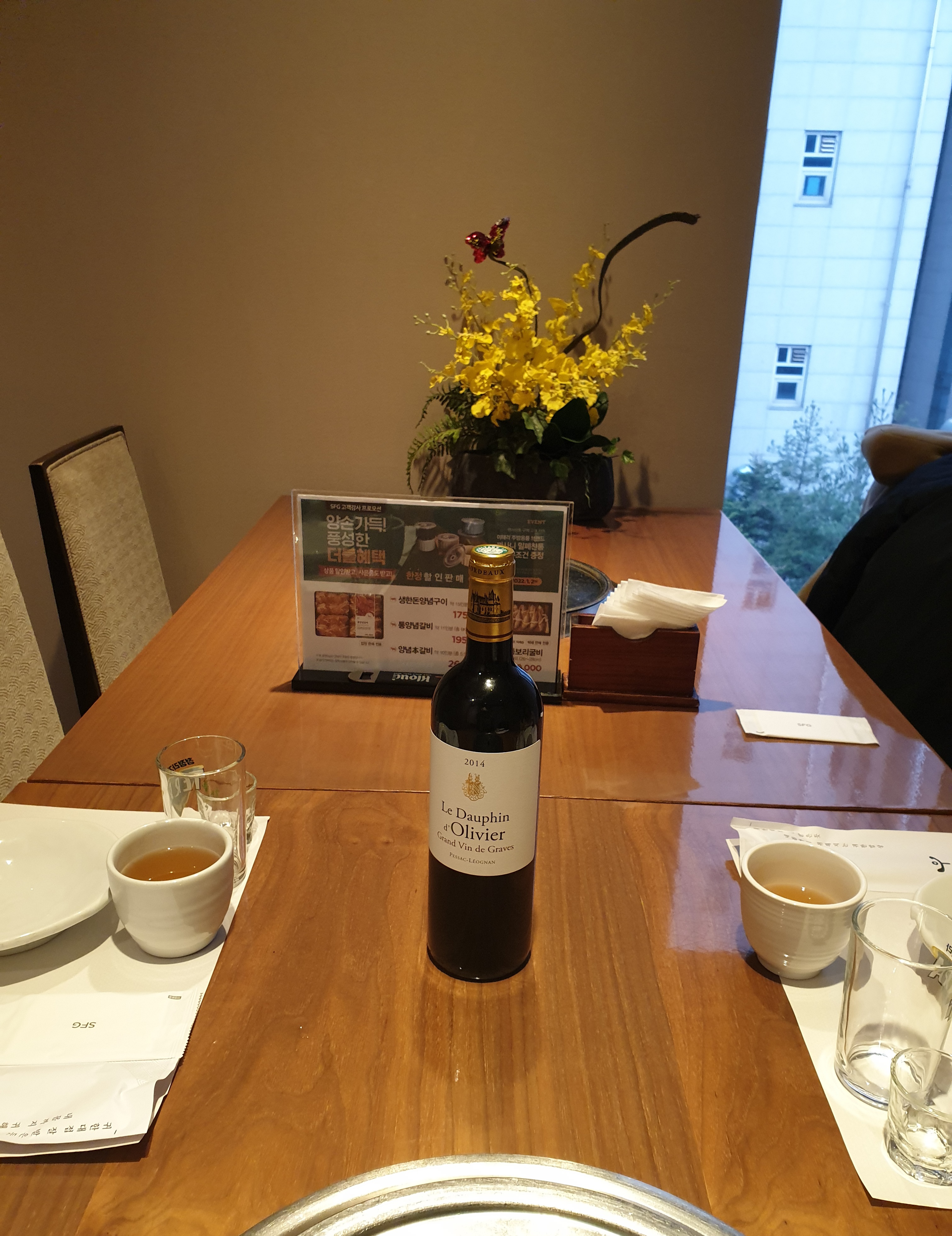 그리고 고기를 먹으면 알콜과의 조합이 필수인데, 우설화의 좋은 점은 콜키지가 된다는 것이다(와인은 2만원, 양주는 3만원), 이 날은 아들이 회사 상무에게서 선물 받은 와인을 가져가서 마셨다.