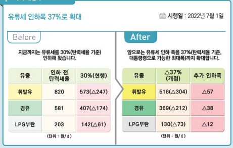 2022년 7월1일부터 12월31일까지 6개월간 휘발유, 경유, LPG부탄에 대한 유류세 인하폭이 기존 30%에서 7%p 증가한 37%로 확대된다. (개별소비세법 시행령, 교통에너지·환경세법 시행령 시행)