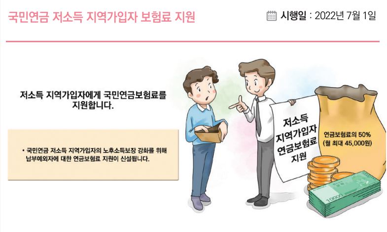 2022년 7월부터 국민연금 사각지대 완화를 위해 저소득 지역가입자에 대한 국민연금보험료 지원이 신설된다.