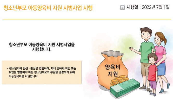 여성가족부는 청소년부모 아동양육비 지원 시범사업을 2022년 7월1일부터 시행한다고 발표하였다.