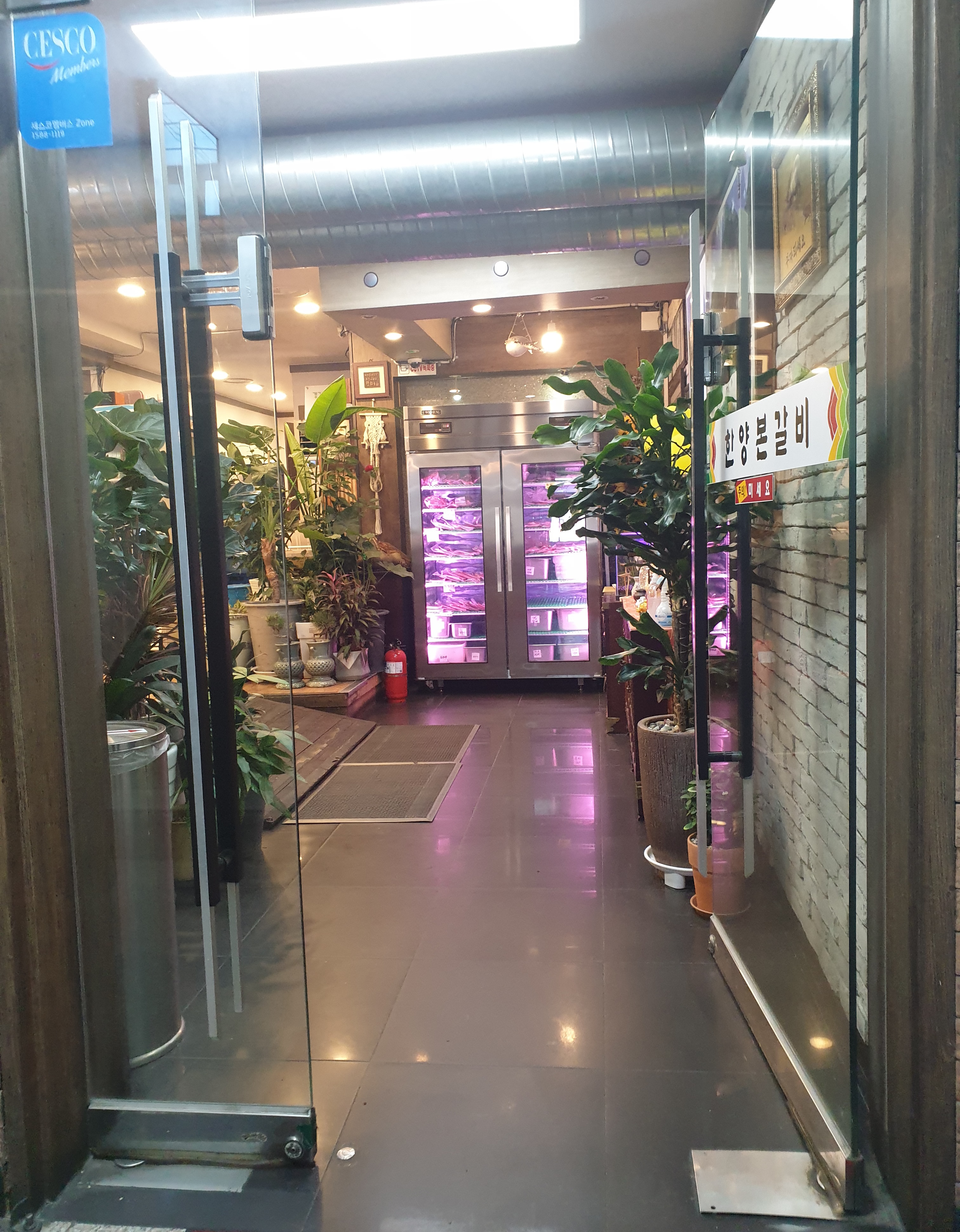 고기를 숙성 중인 대형 냉장고가 보인다.