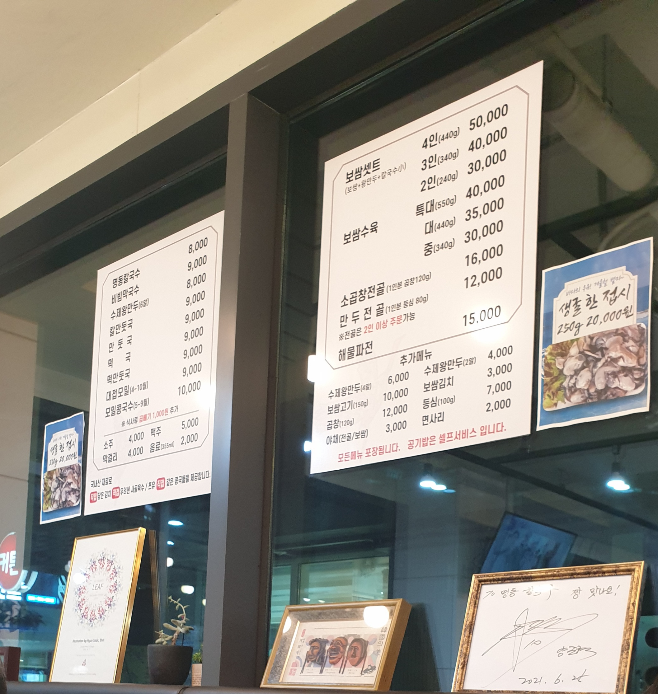 식당 자체도 동네 흔히 있는 칼국수 식당 규모이지만, 맛에 있어서는 체인점이 아닌데도 서울에 있는 명동칼국수 맛을 제대로 느낄 수 있다. 비단 칼국수뿐만 아니라 보쌈수육과 소곱창전골도 잡내 없이 깔끔한 맛으로 식욕을 돋운다.
