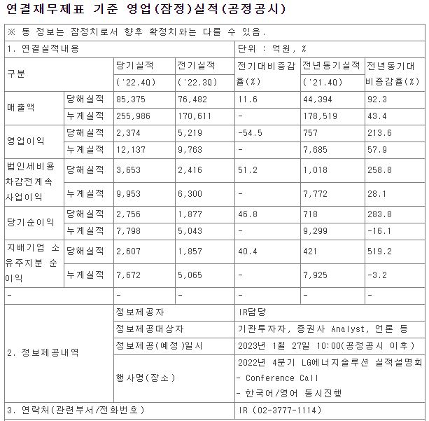 오늘은 LG에너지솔루션이 2022년도의 실적을 잠정 발표하였기에 이에 대해 포스팅합니다.