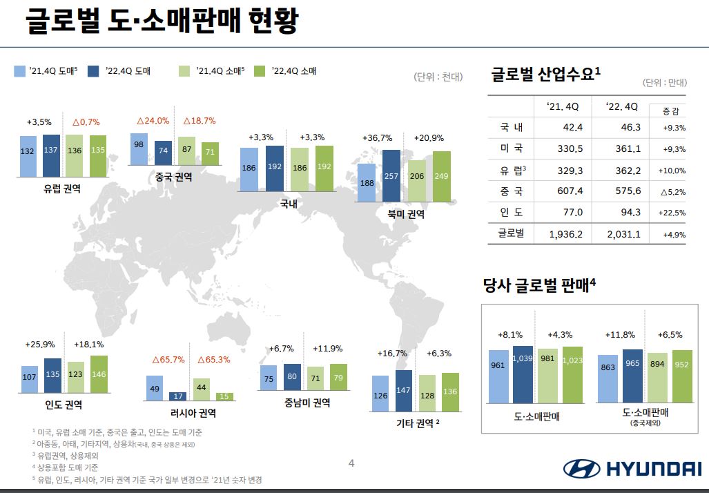 국내 시장을 살펴보면, 지난해 연말 출시한 7세대 디 올 뉴 그랜저와 제네시스 라인업 등 고부가가치 차종이 견조한 판매를 보였고, 해외 시장에서는 부품 수급 개선에 따른 생산 증가와 더불어 아이오닉 6의 글로벌 본격 판매 등 친환경차 중심의 판매 호조가 이어진 결과로 보인다.