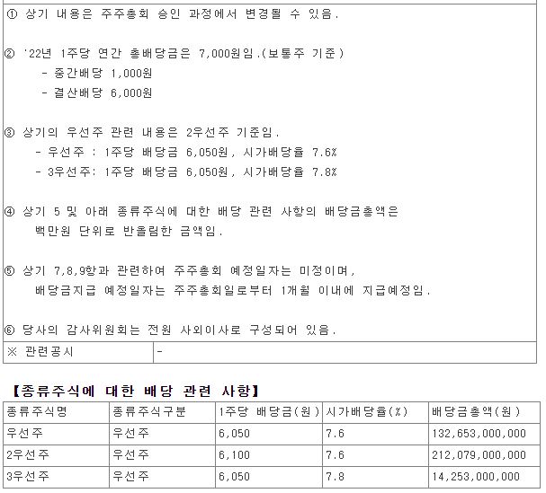 배당에 대해서도 발표하였는데, 보통주 기준 1주당 6,000원을 배당한다고 공시하였다. 배당금 총액은 1조 5,725억 원이고, 배당기준일은 2022년 12월 31일이다. 배당금의 입금은 주주총회가 개최되는 4월 중으로 거래한 증권계좌로 들어온다.