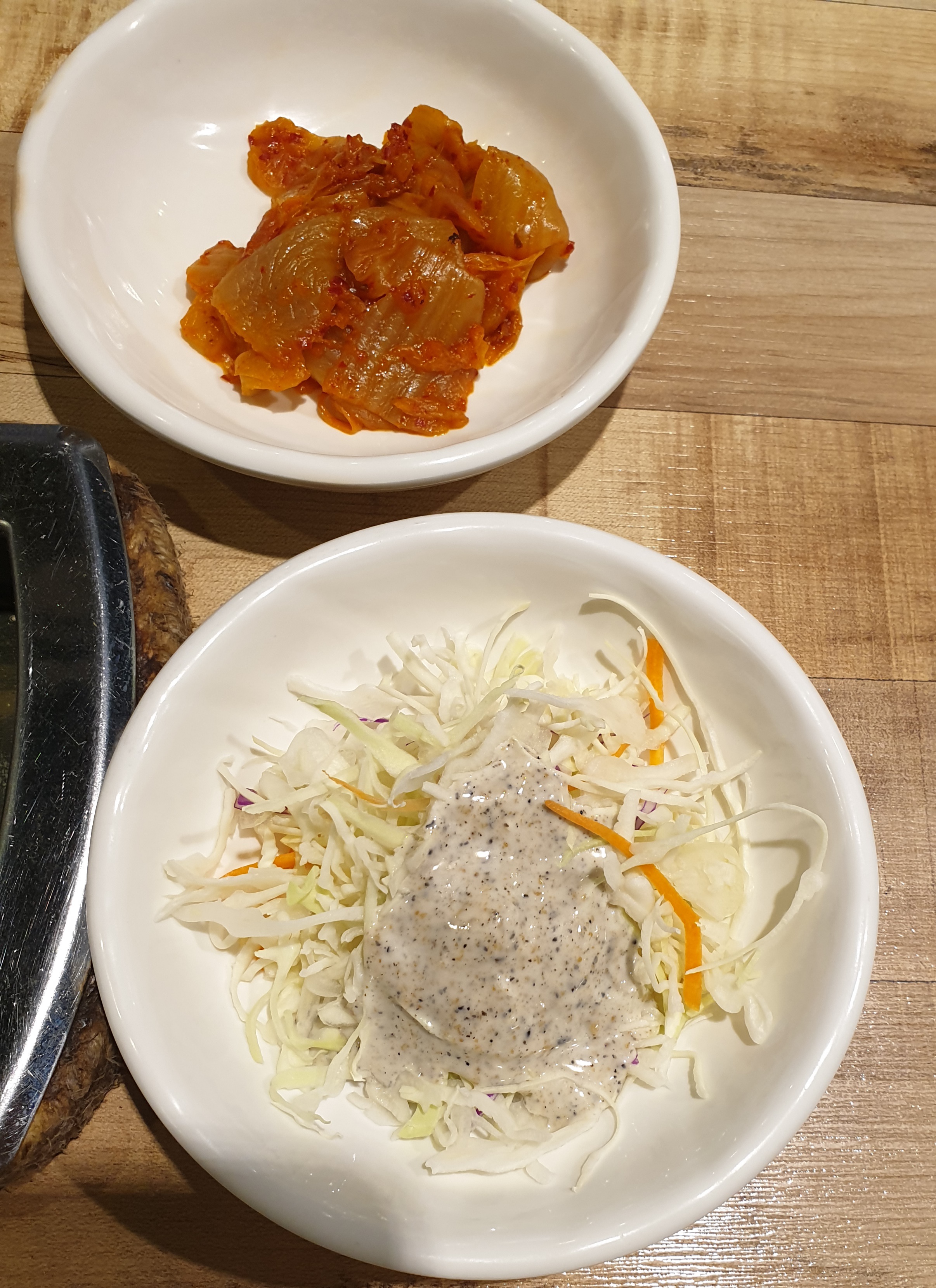 밑반찬으로는 볶음김치와 샐러드가 나오고