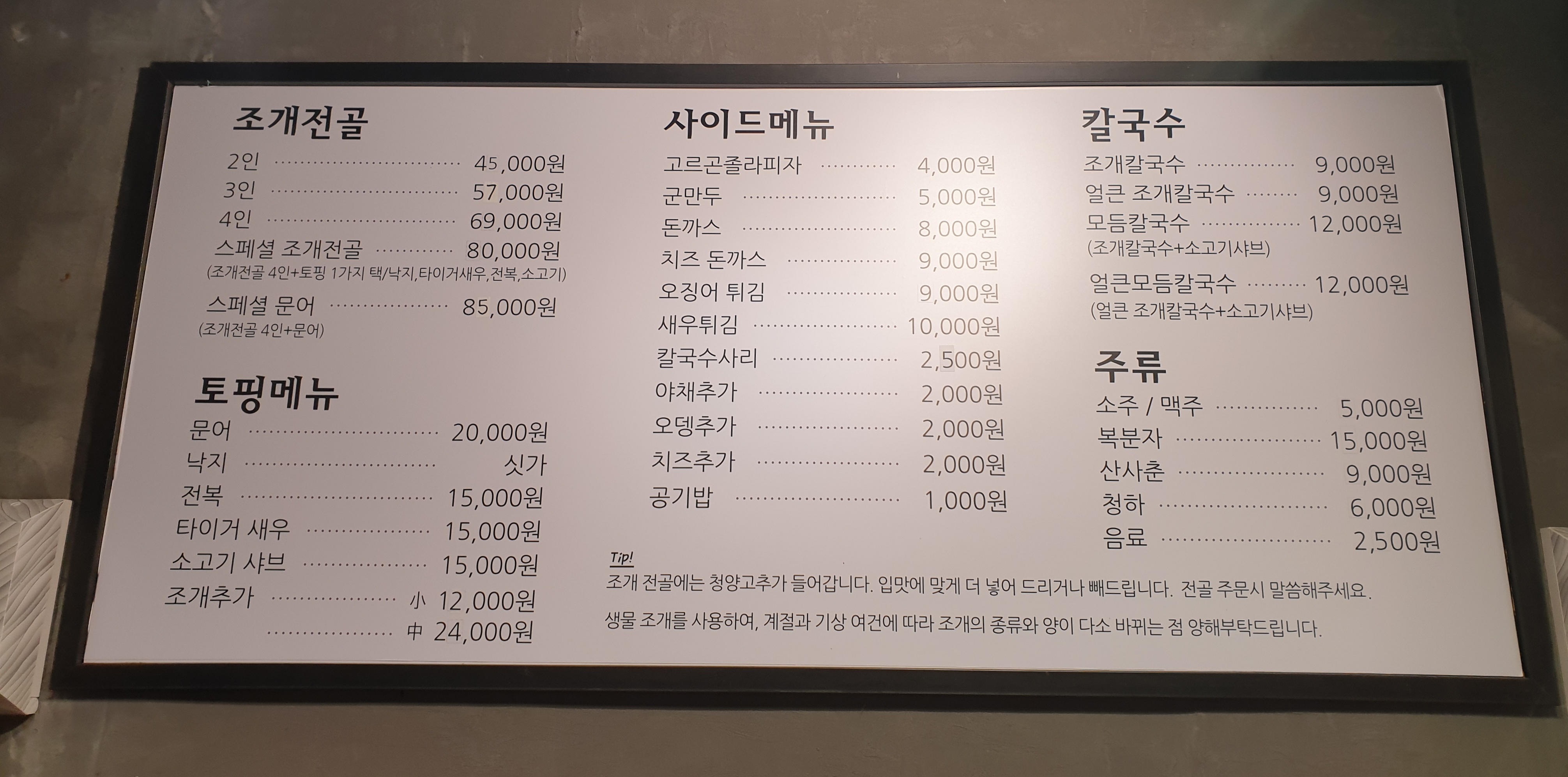 조개전골 3인분에 토핑메뉴로 문어를 시켰는데, 이후 합류한 고교동창과 셋이서 모자람이 없이 먹을 정도로 양이 많았다. 물론 조개를 다 건져 먹고 난 후 칼국수 사리를 넣어 칼국수로 마무리한 것도 한 몫하였지만..
