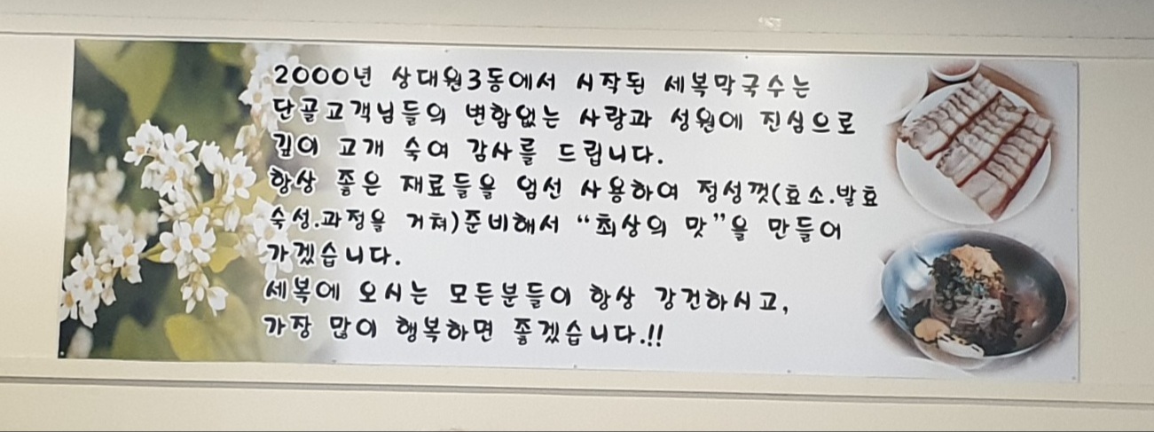 2000년 상대원3동에서 시작된 세복막국수는 단골고객님들의 변함없는 사랑과 성원으로 지금까지 이어오고 있다고 하는데, 단대오거리역 근처에 있기에 접근성도 좋아 주변에 사는 분들께 방문을 추천드린다.
