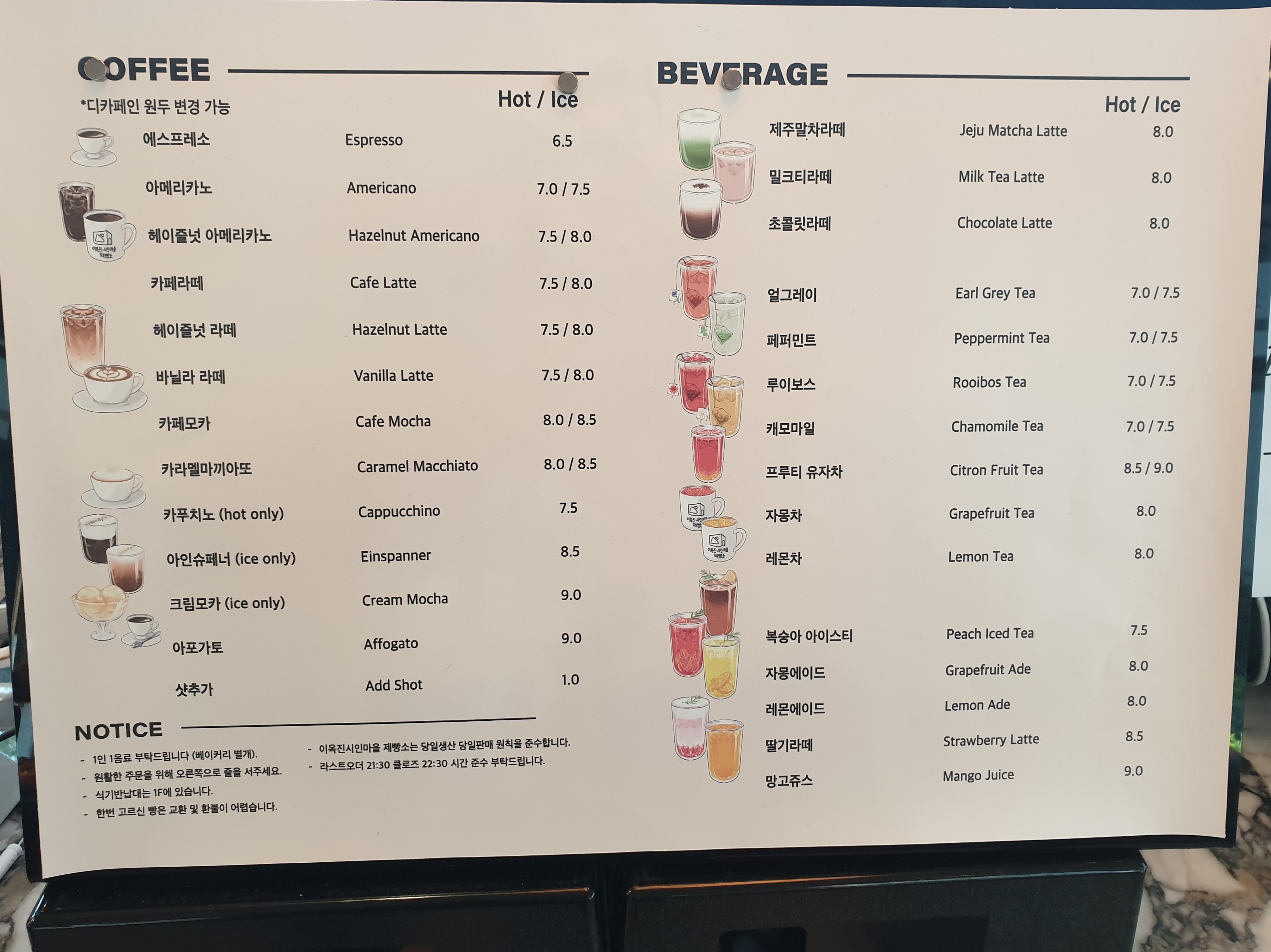 커피 등 다양한 음료 메뉴들로 가격이 좀 나가는 편이다.
