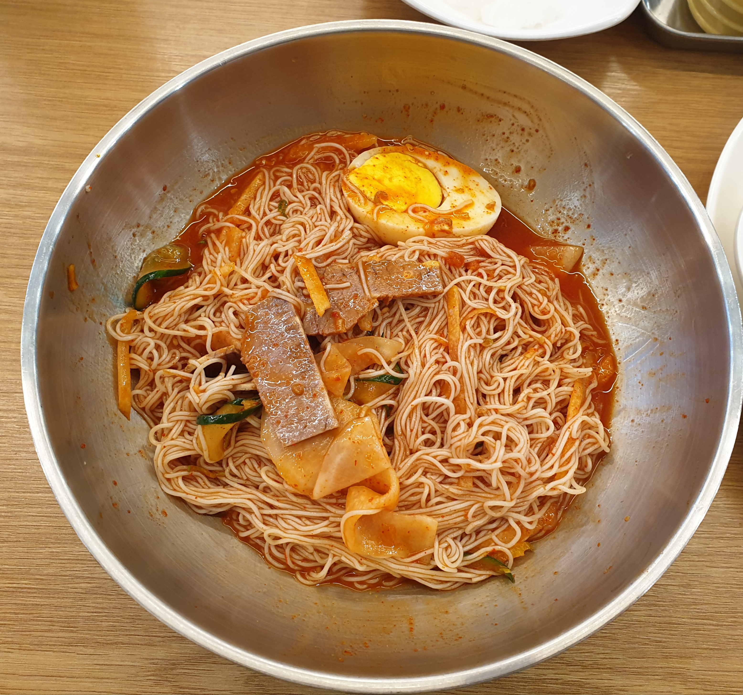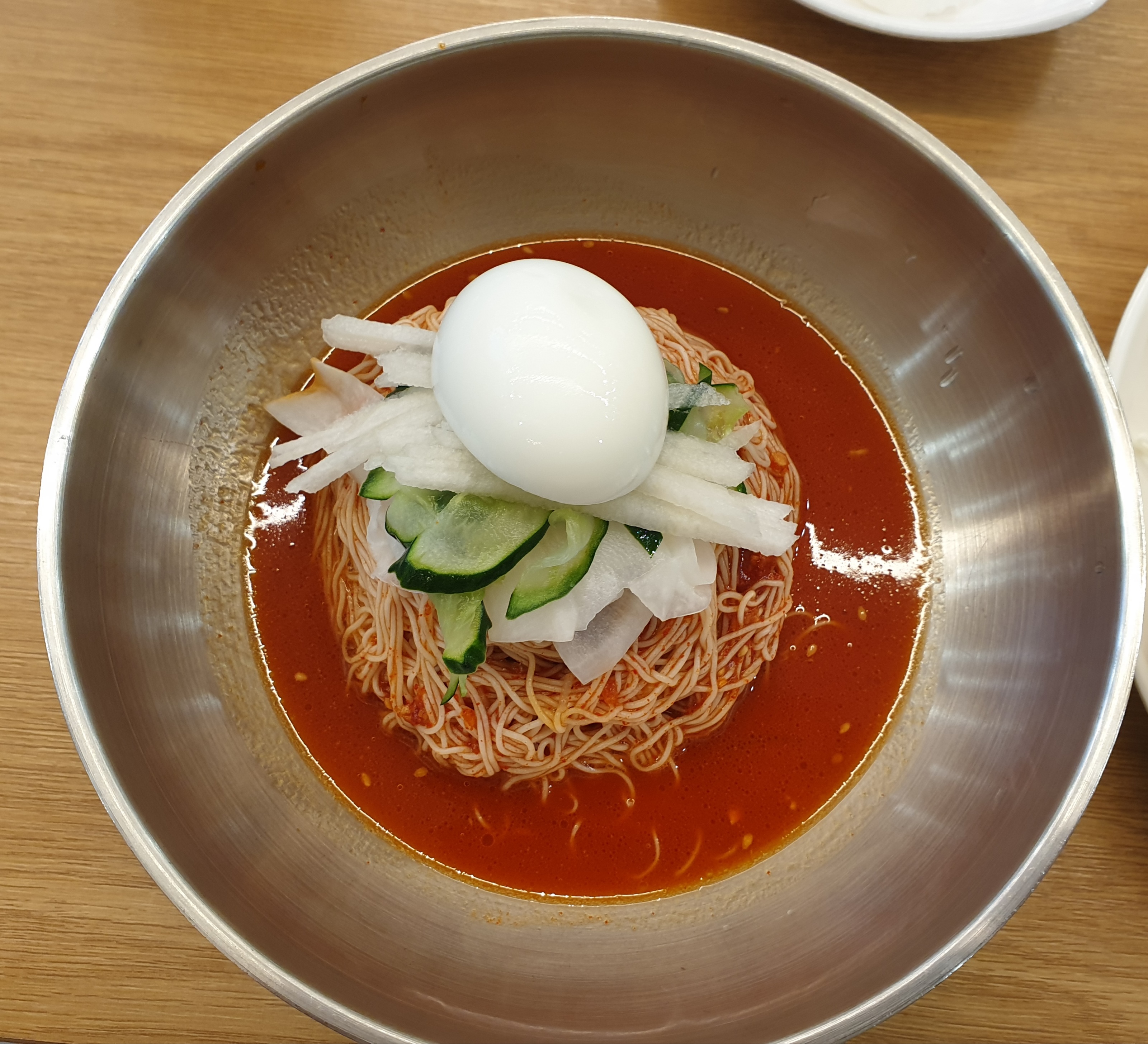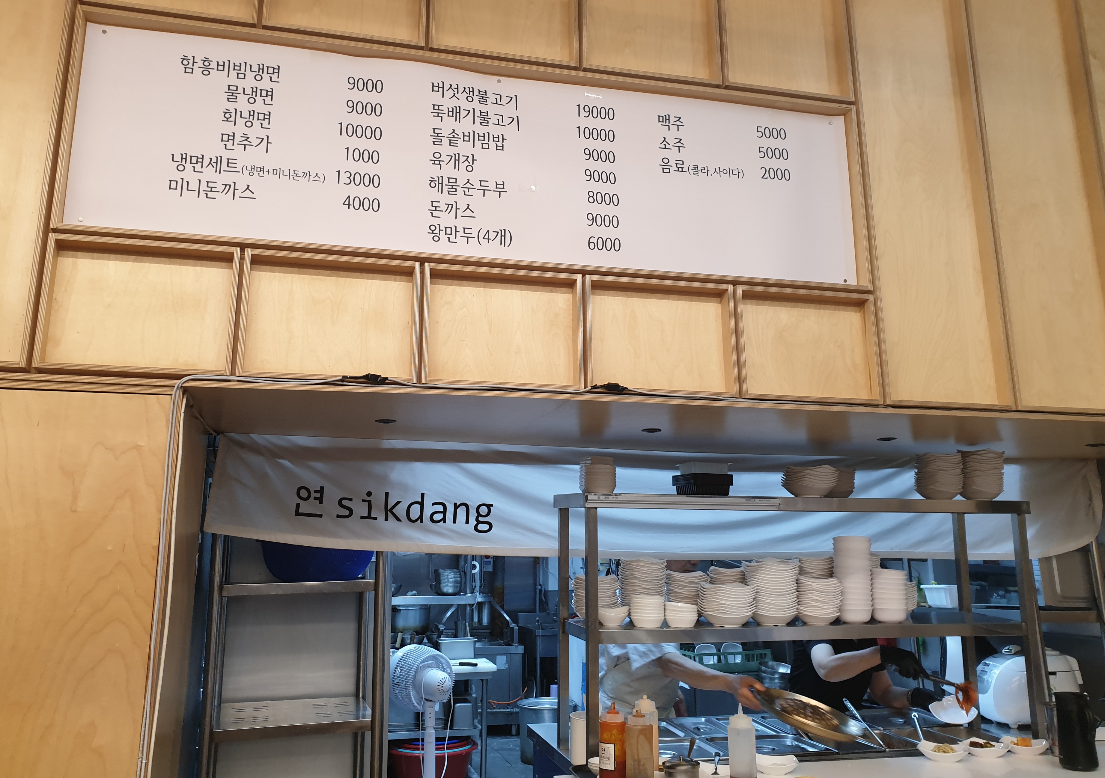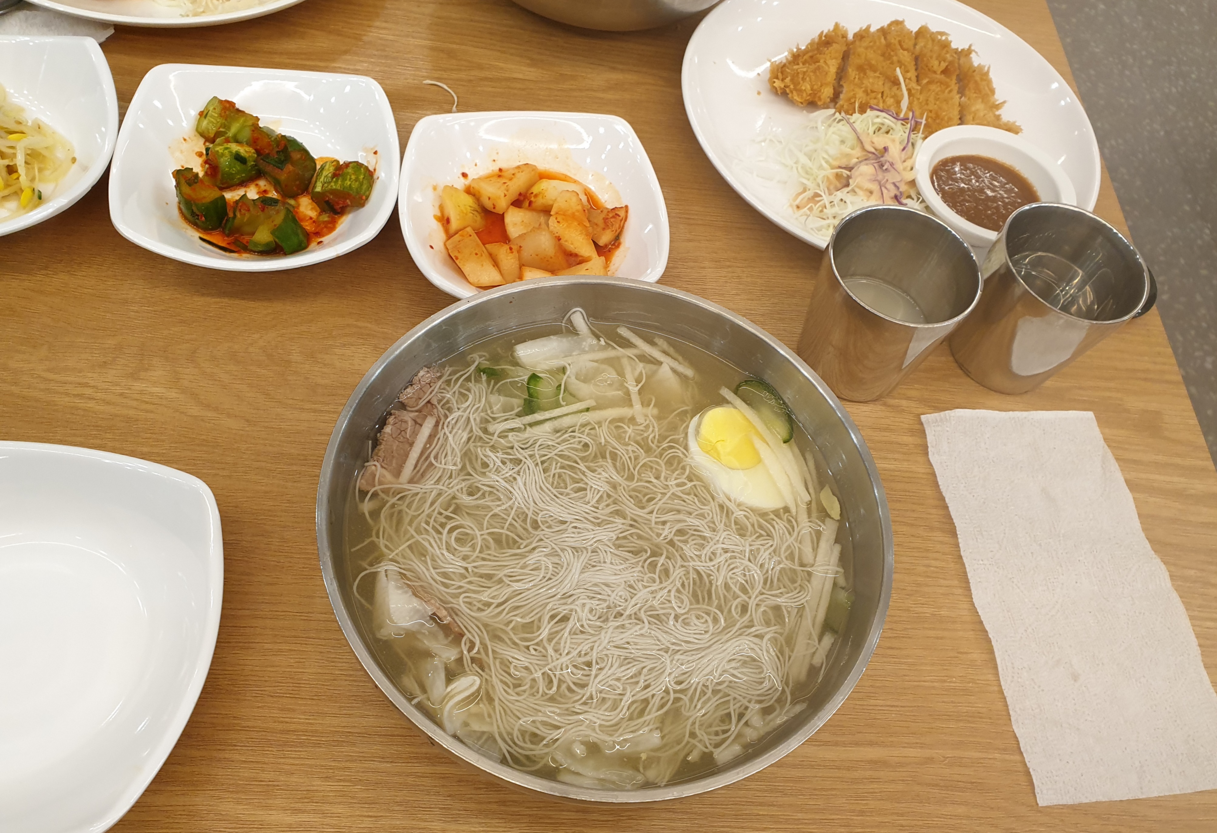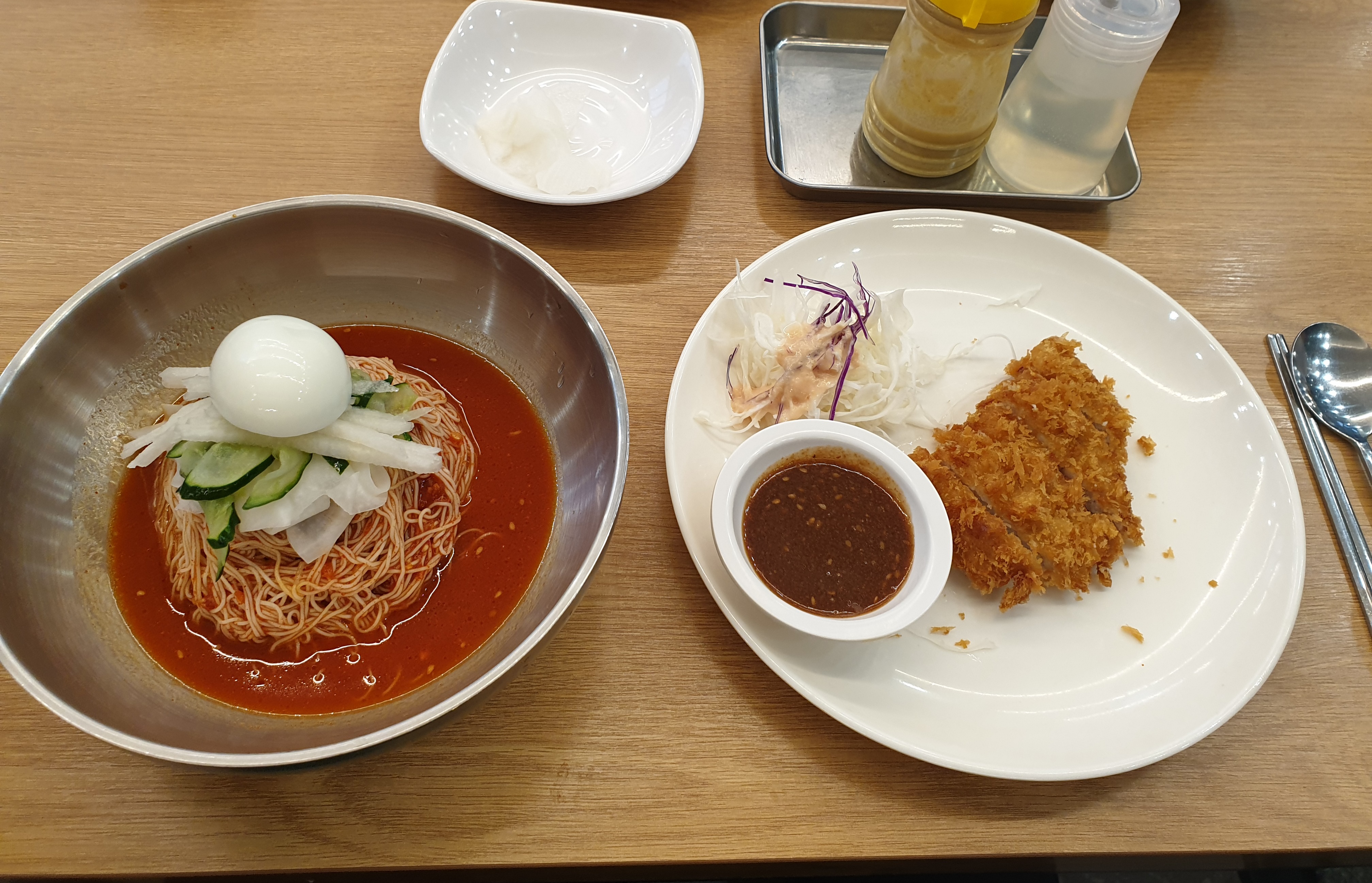 여러 메뉴 중 면을 직접 반죽해서 뽑는 함흥 비빔냉면이 좋았는데, 특히 두툼하고 바삭한 돈까스와 같이 나오는 세트메뉴가 탄수화물과 단백질을 동시에 맛볼 수 있기에 많이 찾는다고 한다.