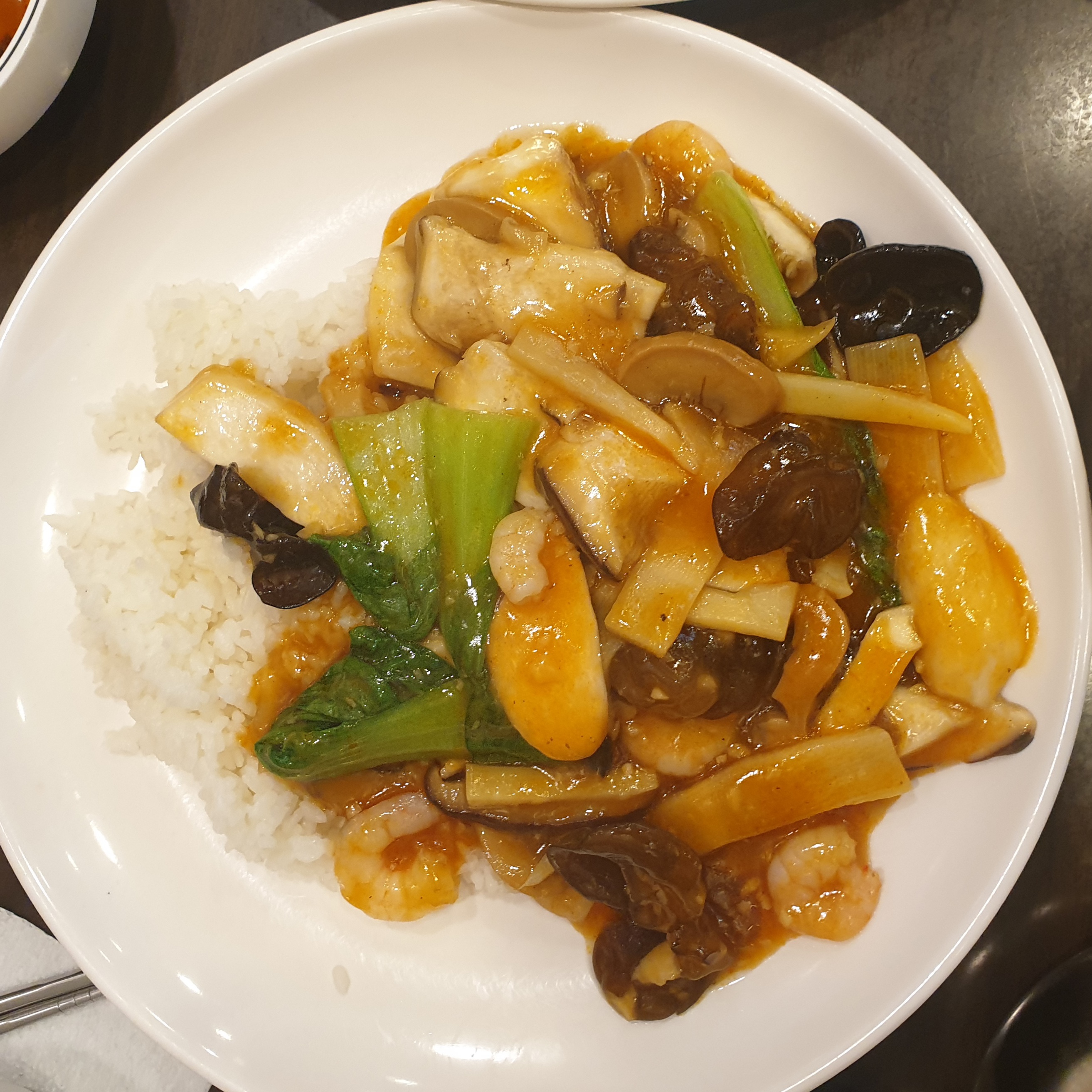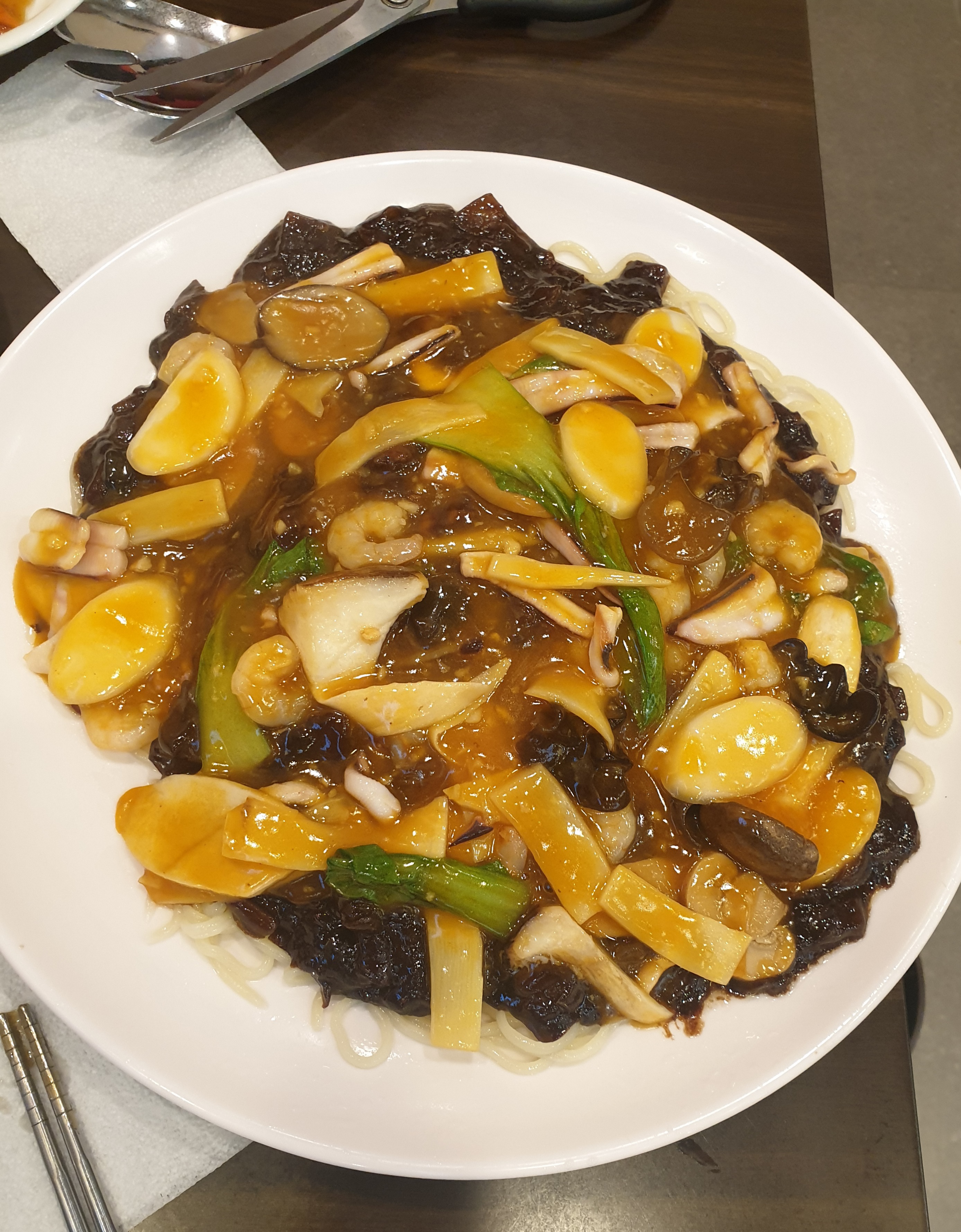 청경채, 버섯, 새우, 떡 등이 짜장과 어우러져