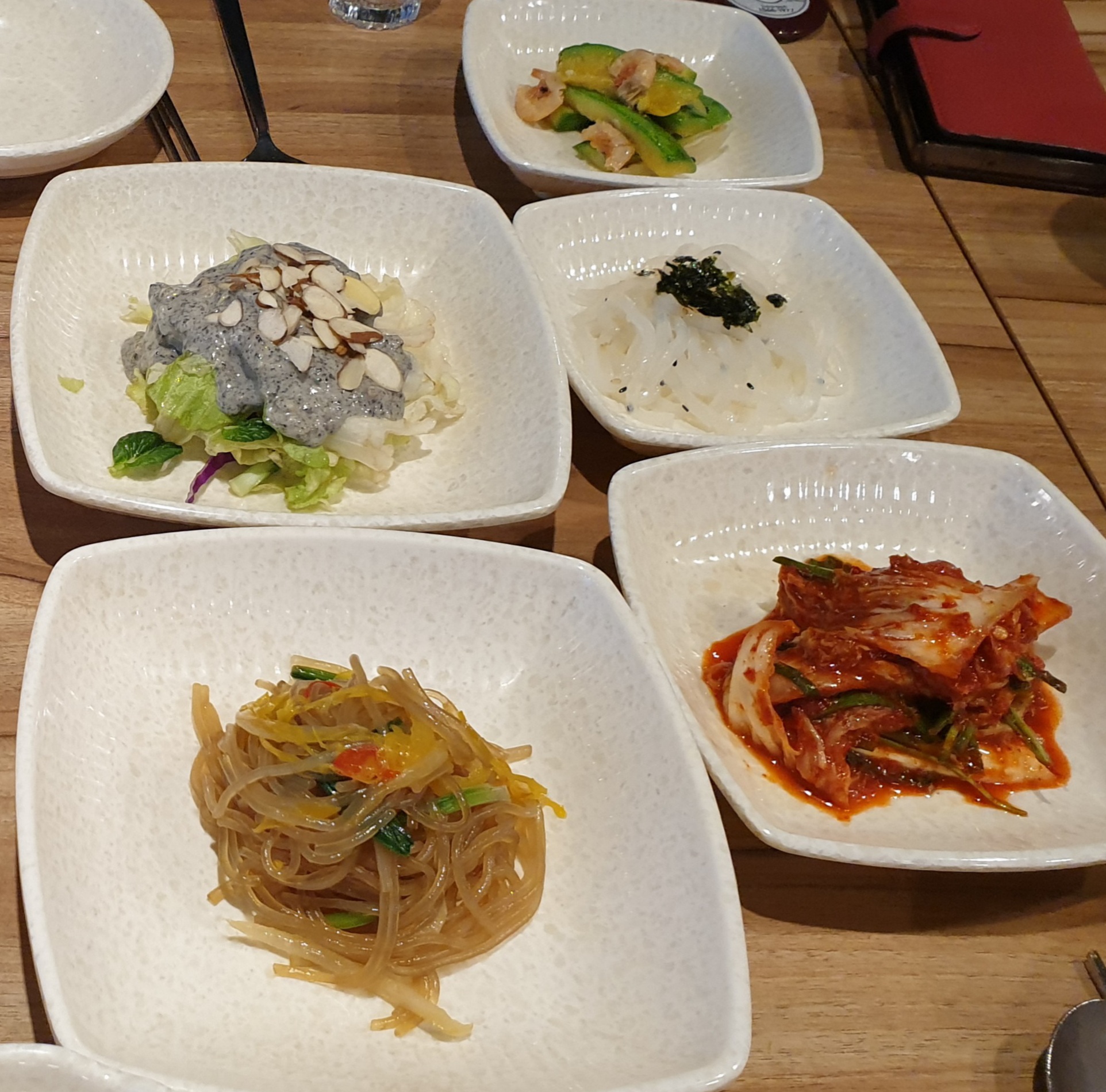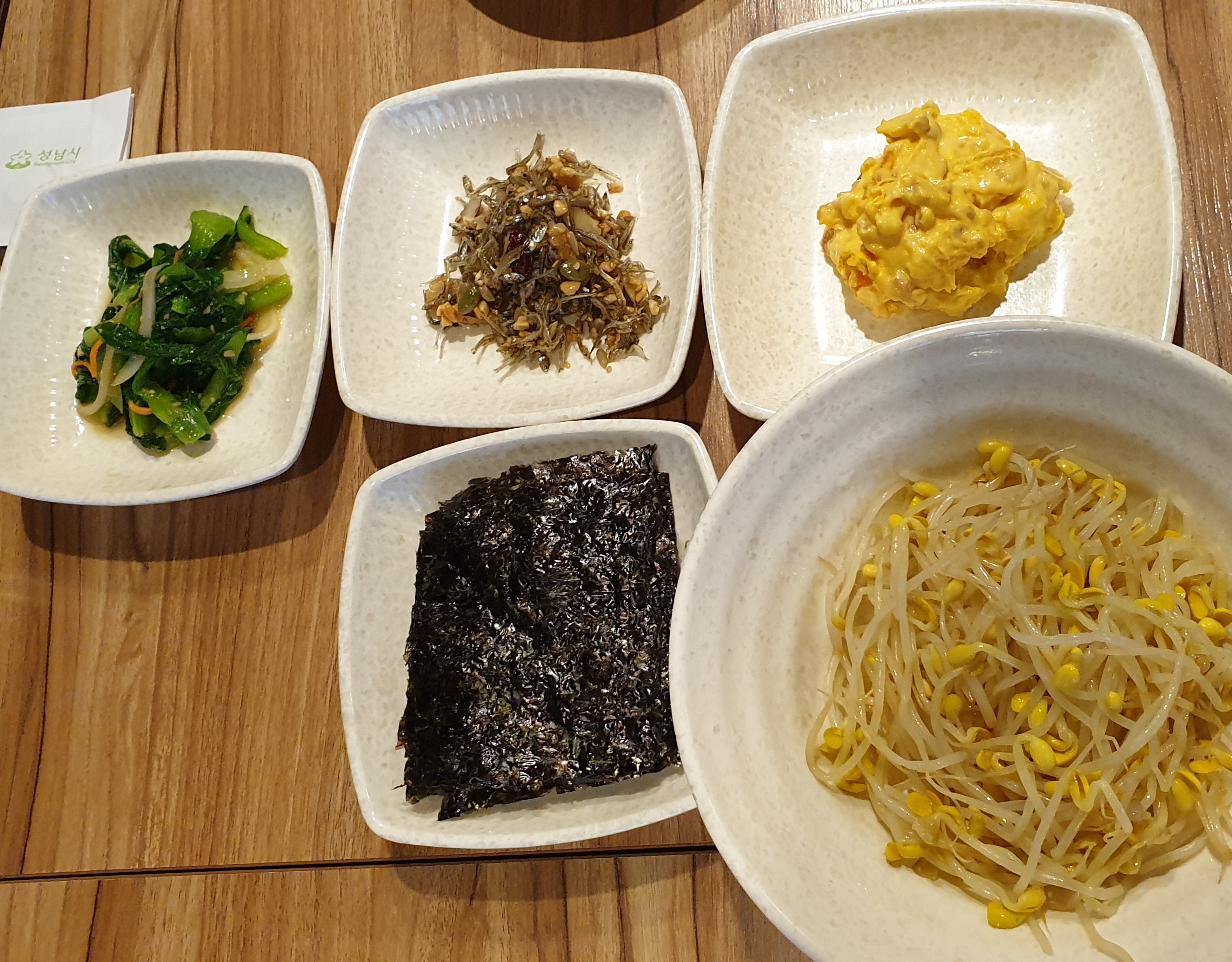 시금치무침, 잡채, 멸치볶음, 감자샐러드, 묵채, 호박볶음, 김 등이 나오는데