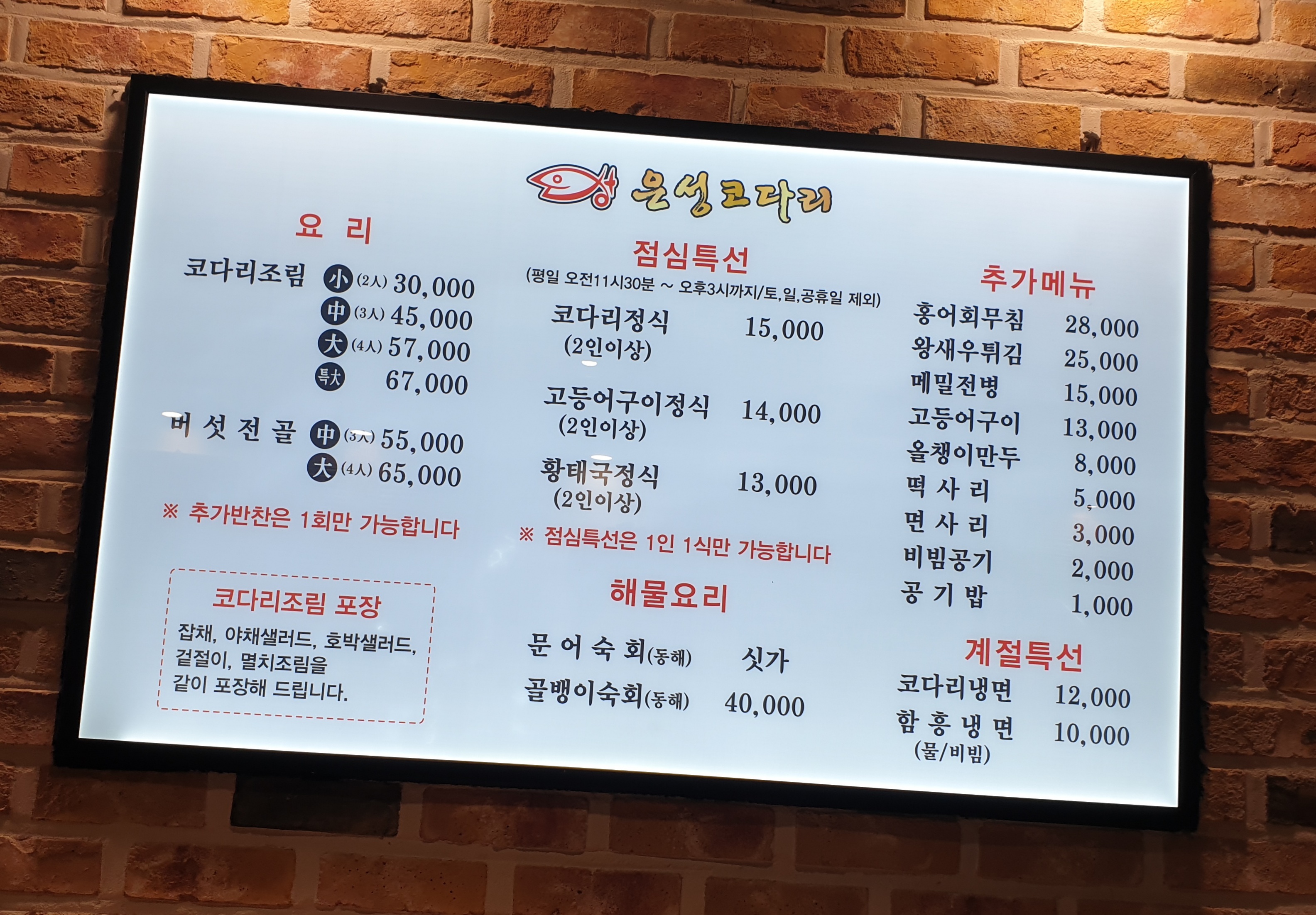 식당 내부로 들어가면 밖에서 보기보다는 꽤 널찍했고 깨끗하며 청결하다. 또한 코다리 요리도 맛있지만 밑반찬이 정갈하고 깔끔하기에, 코다리 요리보다는 밑반찬 때문에 단골손님이 많다고 하는 게 허언이 아닌 듯하다. 우리 일행도 코다리찜과 같이 먹을 밑반찬을 여러 번 가져다 먹었다.