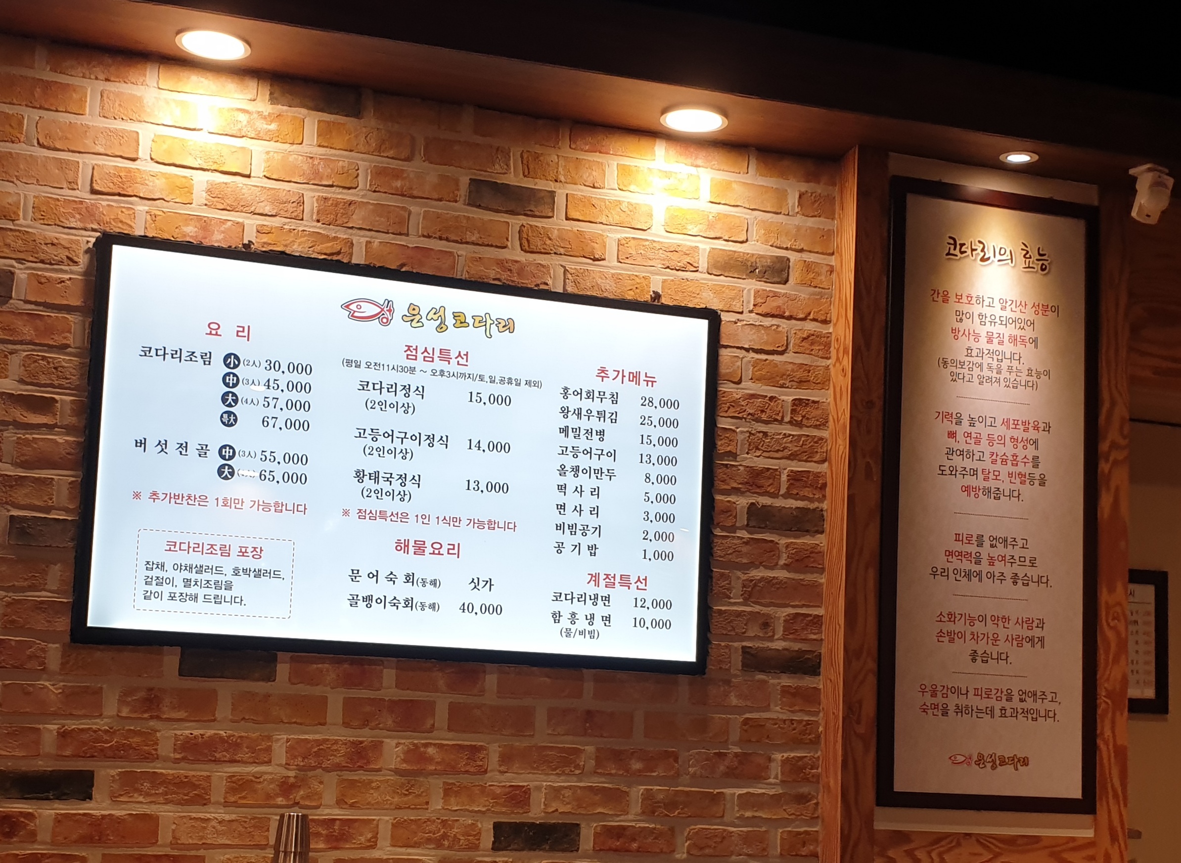 메뉴판과 코다리의 효능이 벽면에 붙어있어