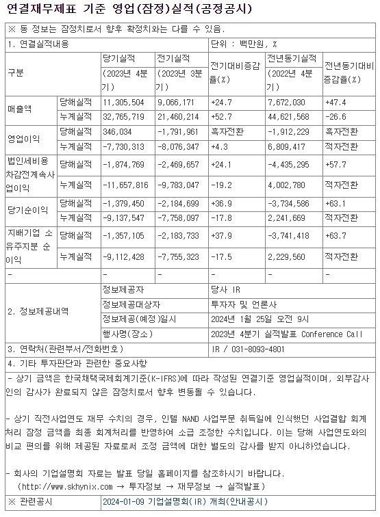 SK하이닉스는 1월 25일 실적발표회를 열고 2023년 기준 연간 매출 32조 7,657억 원, 영업손실 7조 7,303억 원, 당기순손실 9조 1,375억 원을 기록했으나, 하반기부터 메모리 반도체 업황 반등이 본격화하면서 지난해 4분기에는 3,460억 원의 영업이익을 기록하면서 흑자 전환에 성공했다고 한다. 이로써 회사는 2022년 4분기부터 이어져 온 영업적자에서 1년 만에 벗어났다.