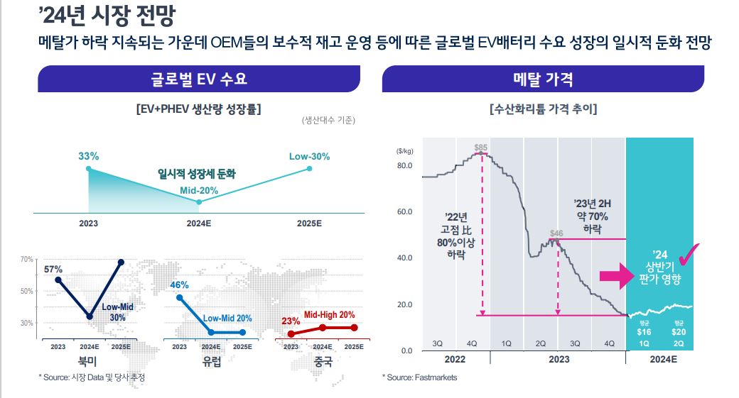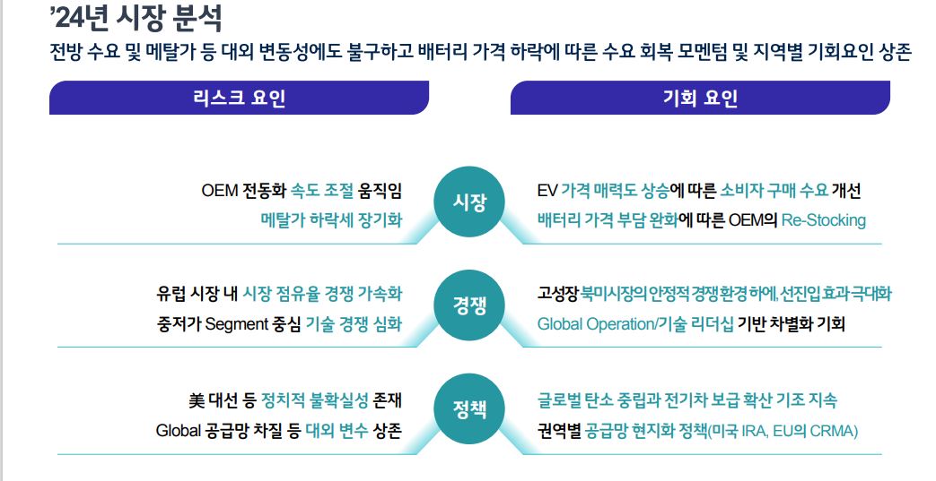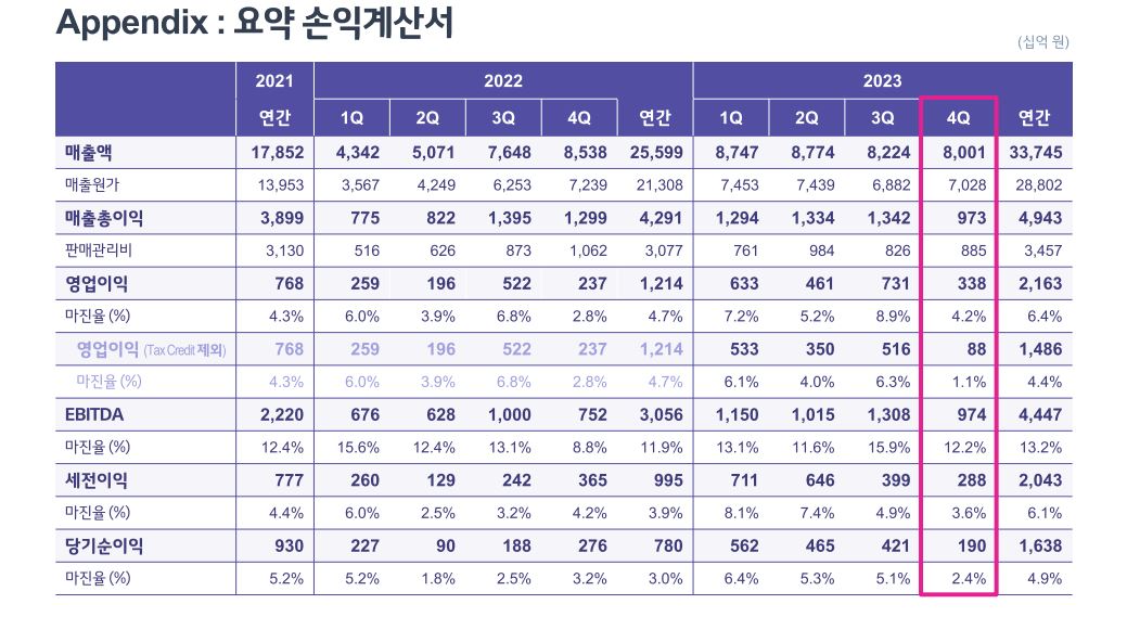 2). 2023년 4분기 손익을 살펴보면, 메탈 가격 하락세 지속에 따른 투입 원재료 가격의 Lagging 영향 확대와 유럽 지역 수요 감소에 따른 폴란드 공장 가동률 축소로 2023년 4분기 영업이익은 3,382억원, 영업이익률은 4.2%를 달성하였다. 한편, 미국 현지 생산 및 판매로 IRA Tax Credit 효과는 전분기 대비 16% 증가한 2,501억원을 기록하였으며, 이를 제외한 영업이익은 881억원을 기록하였다.