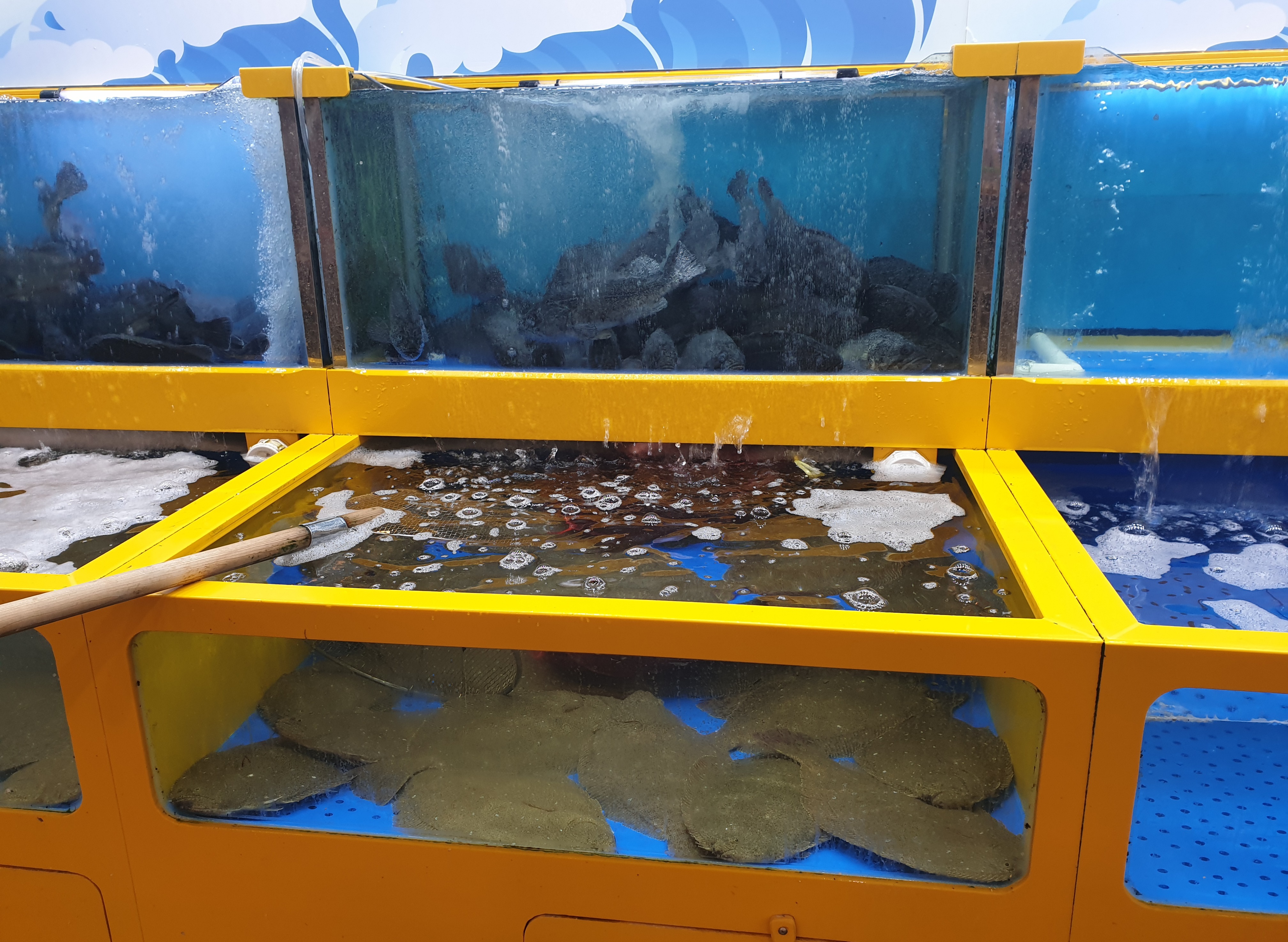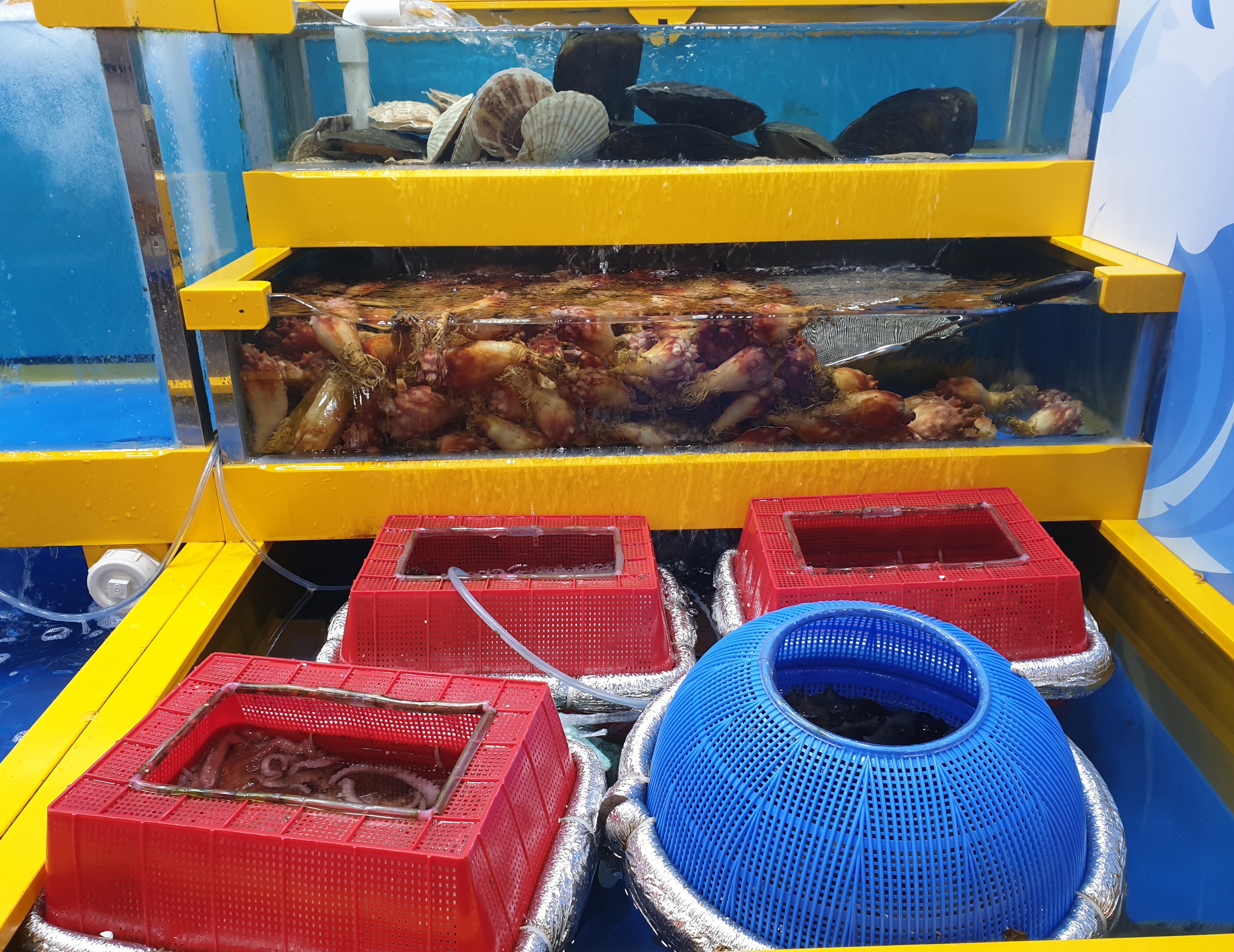 수조에는 싱싱한 수산물 등이 준비되어 있다.