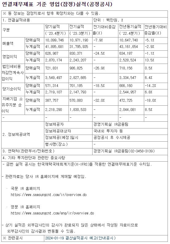 | 삼성엔지니어링 실적 발표 및 배당금 (2024년 1월 30일 발표) (0) | 2024.02.01 |