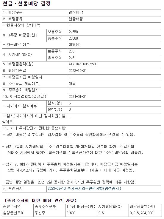 자회사 등 관계사 배당수익의 60~70% 수준에서 지급하는 배당정책 하에 최대 지급률을 적용하여 보통주는 주당 2,550원, 우선주는 주당 2,600원을 배당할 예정이라고 한다.