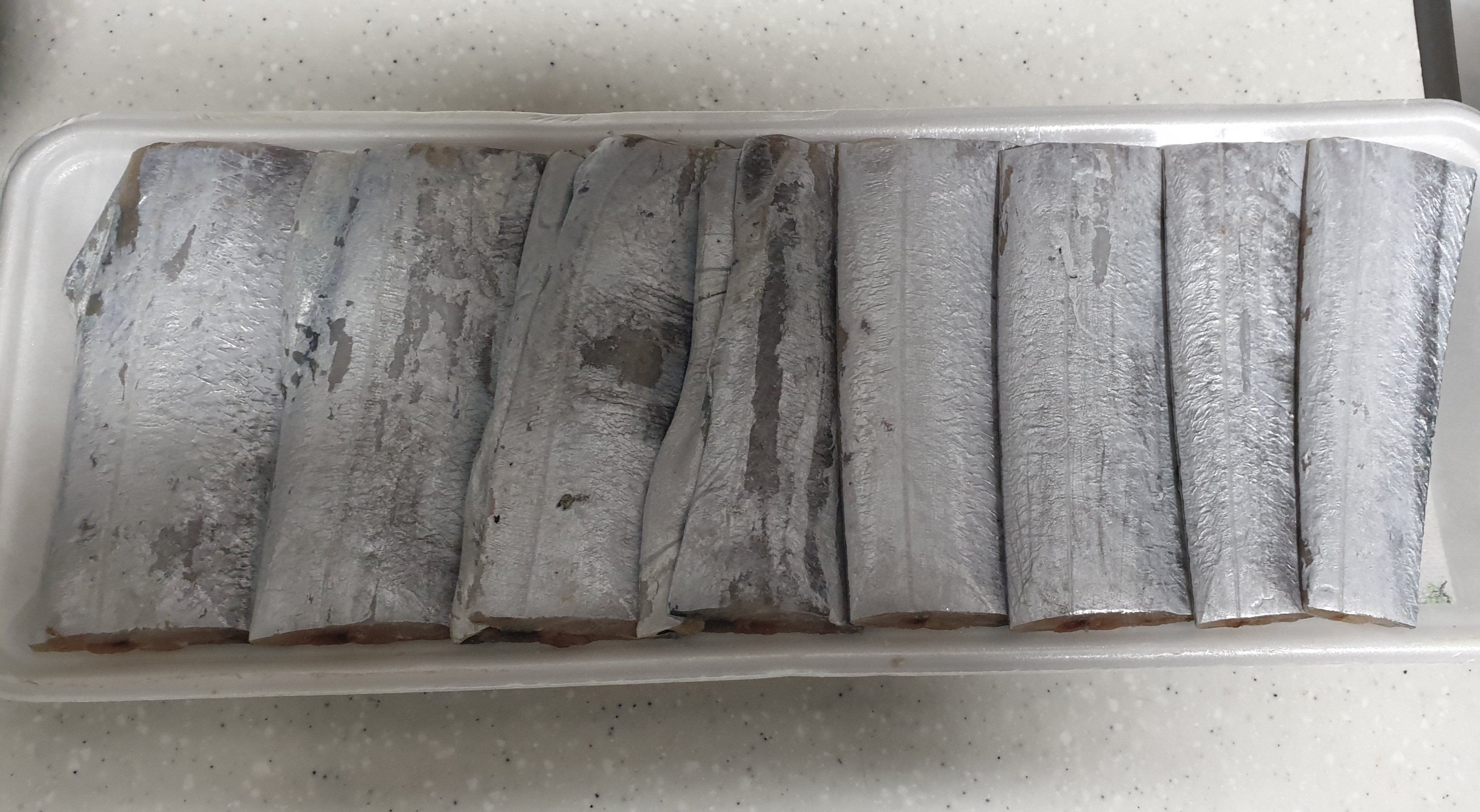 1) 손질된 갈치를 물에 세척하면서 (비린내 등 잡내 제거 위해) 비늘을 가볍게 벗겨낸다