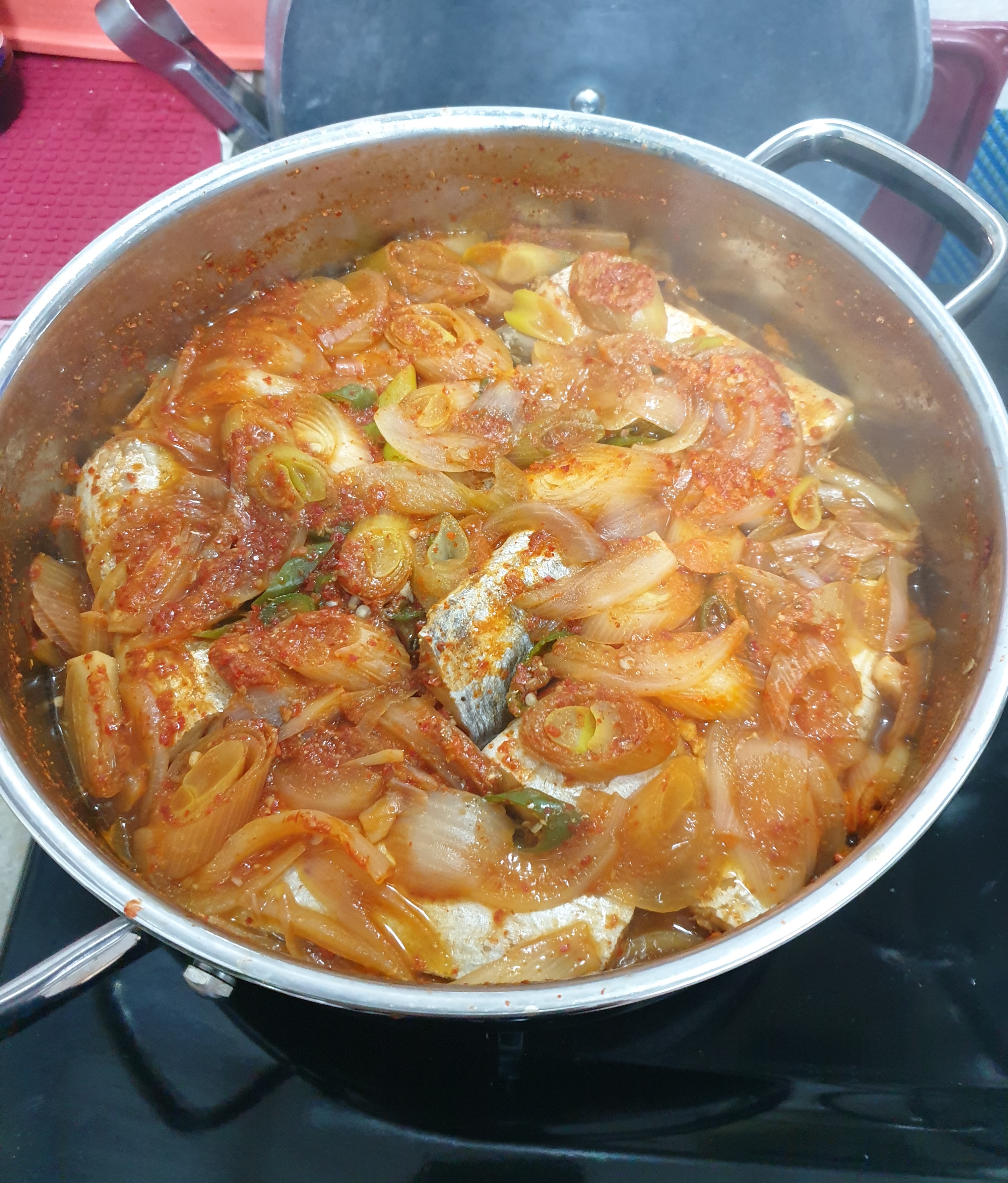 4) 그런 후, 준비한 대파와 양파, 청양고추 등을 올려준 후 뚜껑을 살짝 열고(비린내를 없애기 위해) 5분 정도 센 불로 끓인 후, 다시 뚜껑을 닫고 15분 정도 중약불에 국물이 자작자작할때까지 더 끓이면 밥도둑인 맛있는 갈치조림이 완성된다.