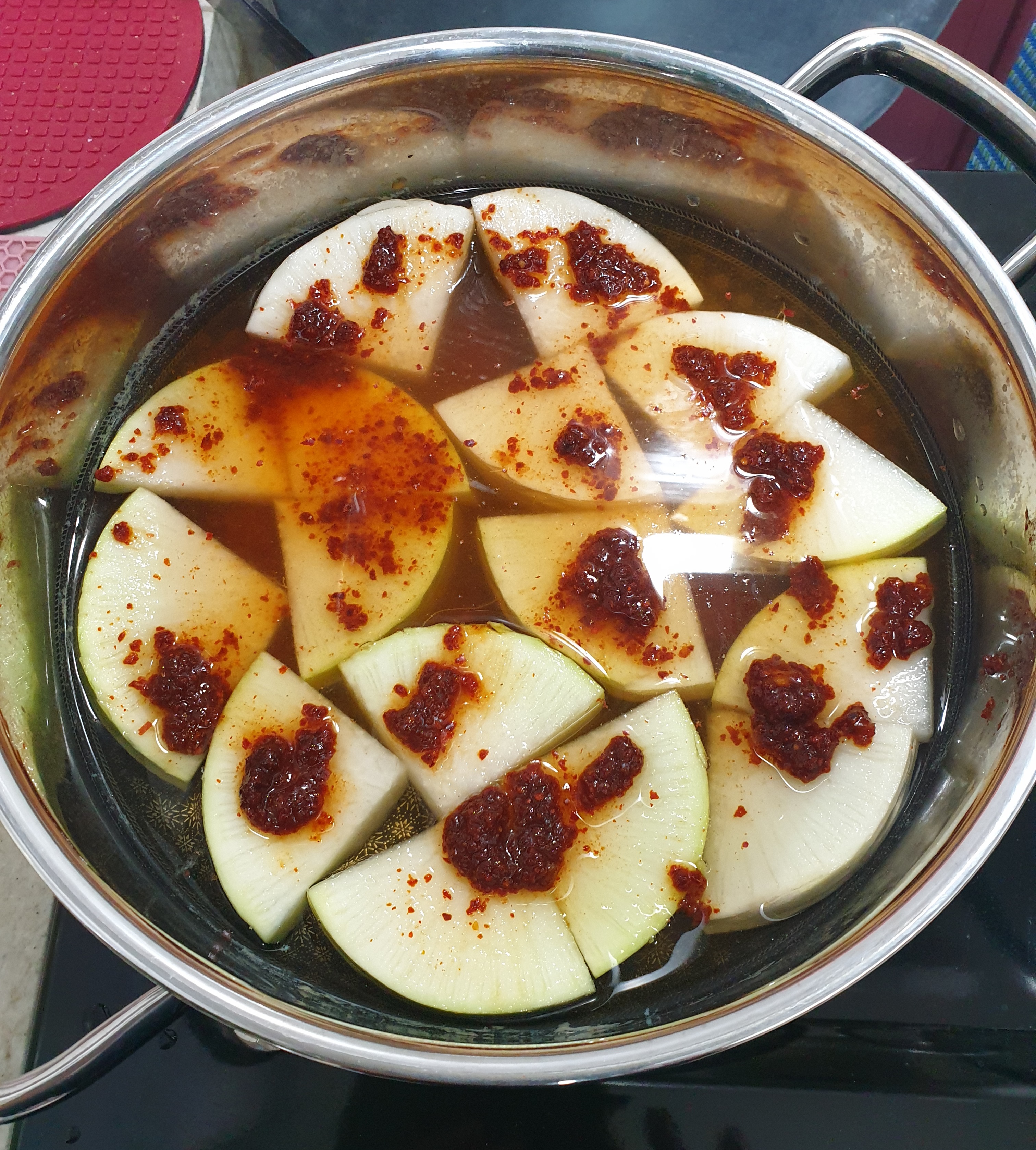 2) 준비해 놓은 양념장 반을 무 위에 올려준 후 뚜껑을 덮고 센 불로 끓인 후 펄펄 끓으면 중약불로 줄여 7분 정도 더 끓여준다.