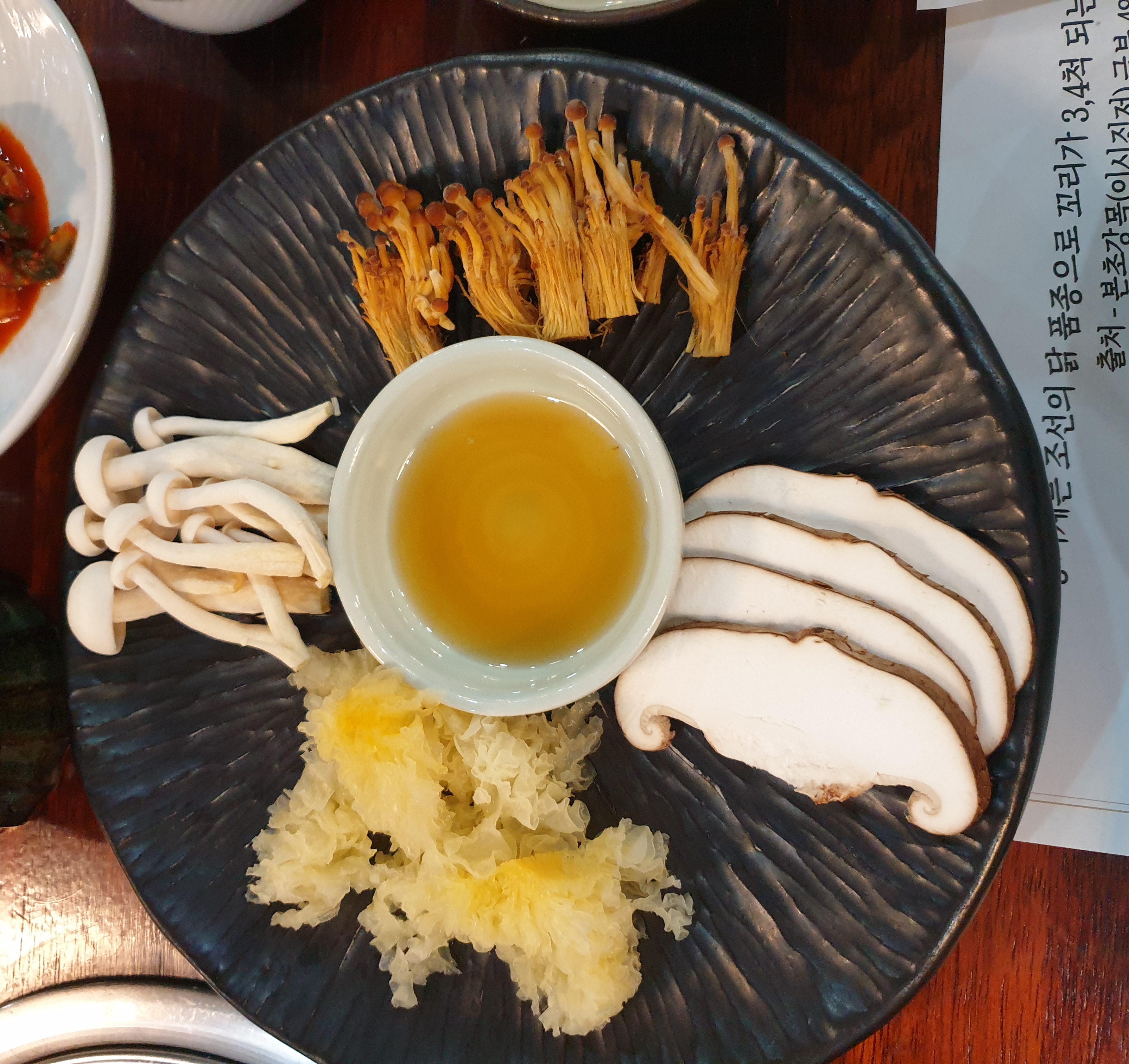 몸에 좋고 향기 좋은 4가지 생버섯이 나오는데, 주인이 직접 짜왔다는 들기름에 찍어 먹으면 고소한 버섯향이 입안에 가득 퍼진다. 생버섯을 먹기 부담스러우면 닭백숙에 넣어서 끓여 먹어도 된다.