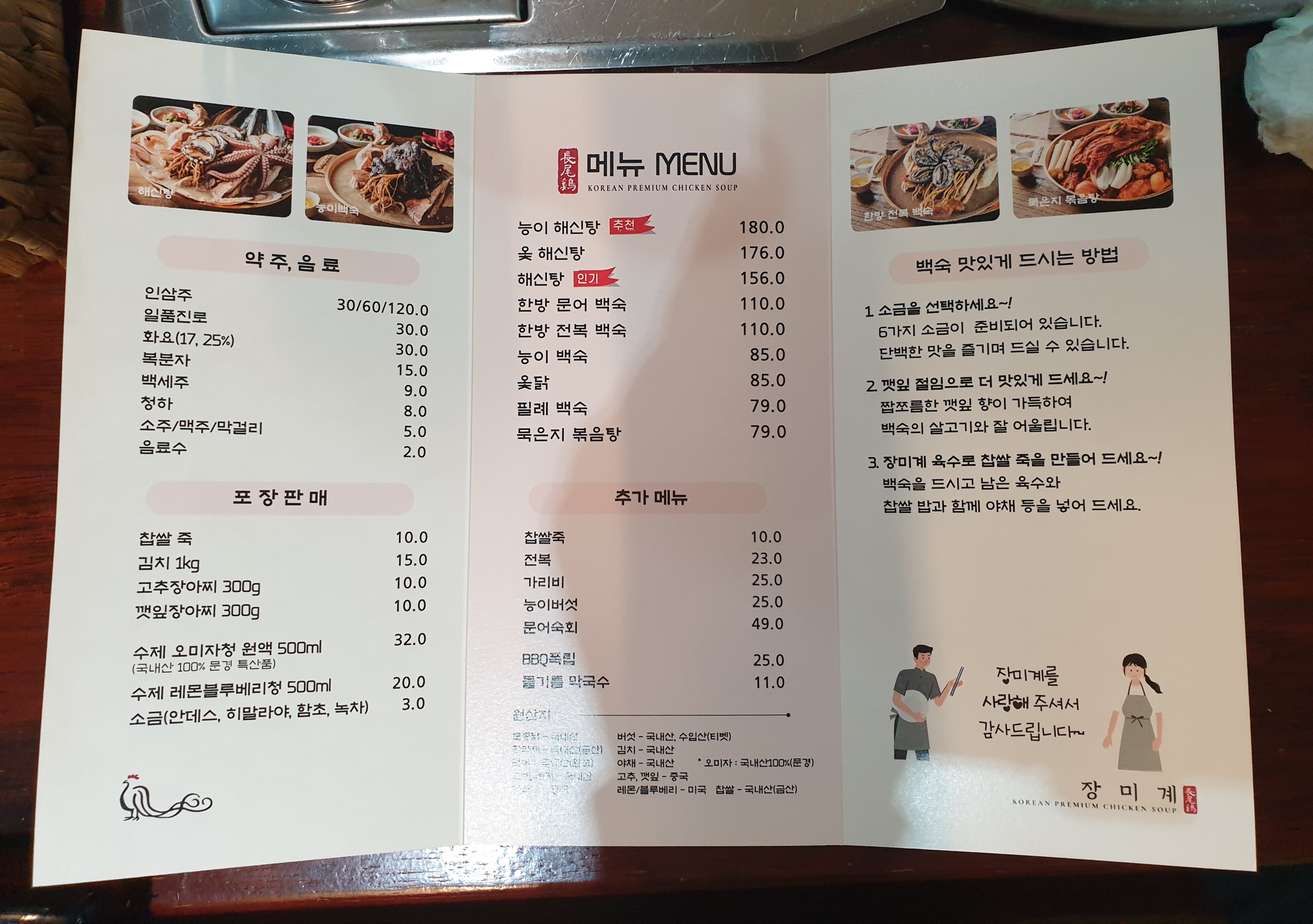 주메뉴인 닭백숙 요리에 들어간 닭이 국내산 토종닭이라서 그런지 닭도 크고 살도 많아 쫄깃쫄깃한 식감과 함께 토종닭 특유의 맛을 느낄 수 있다.