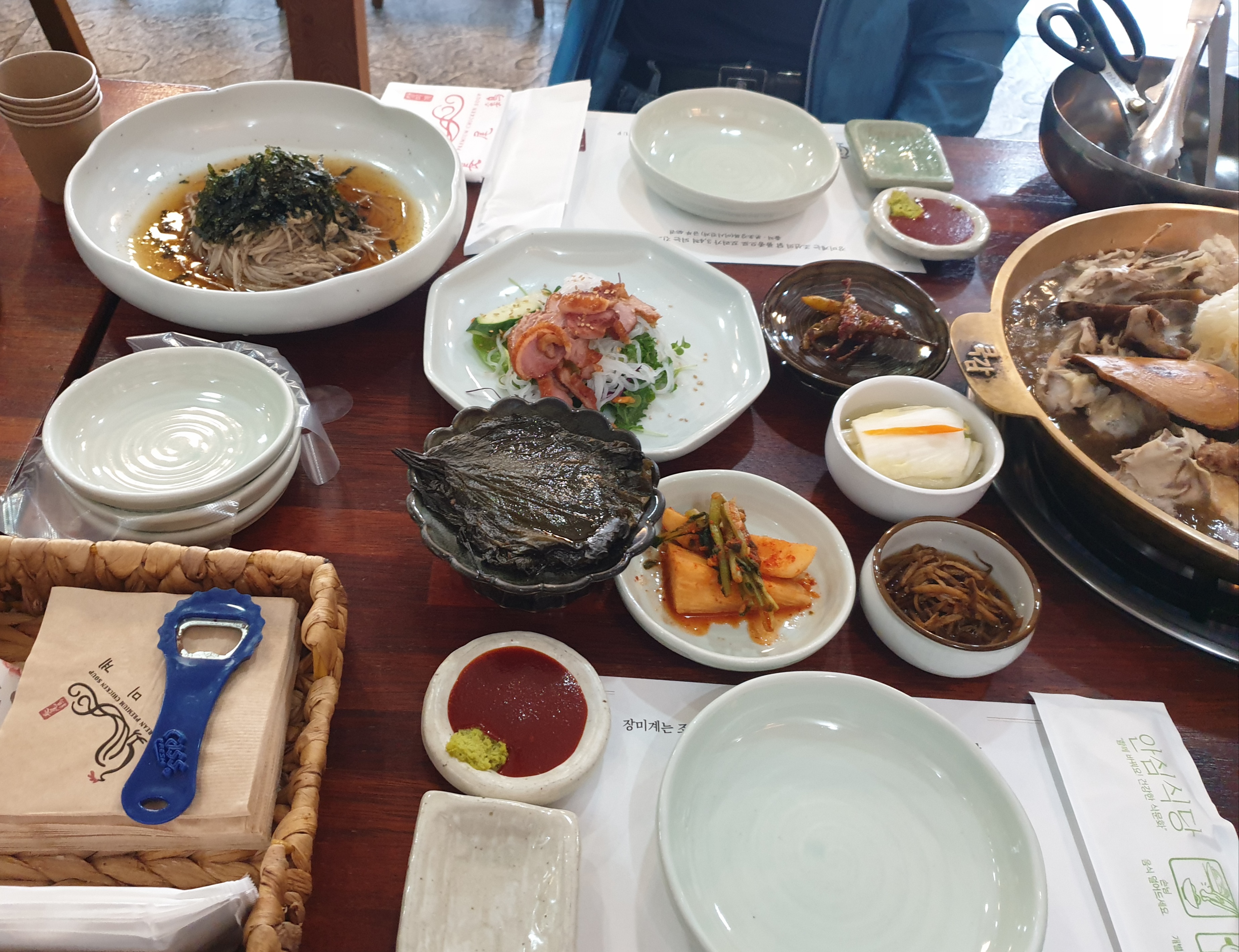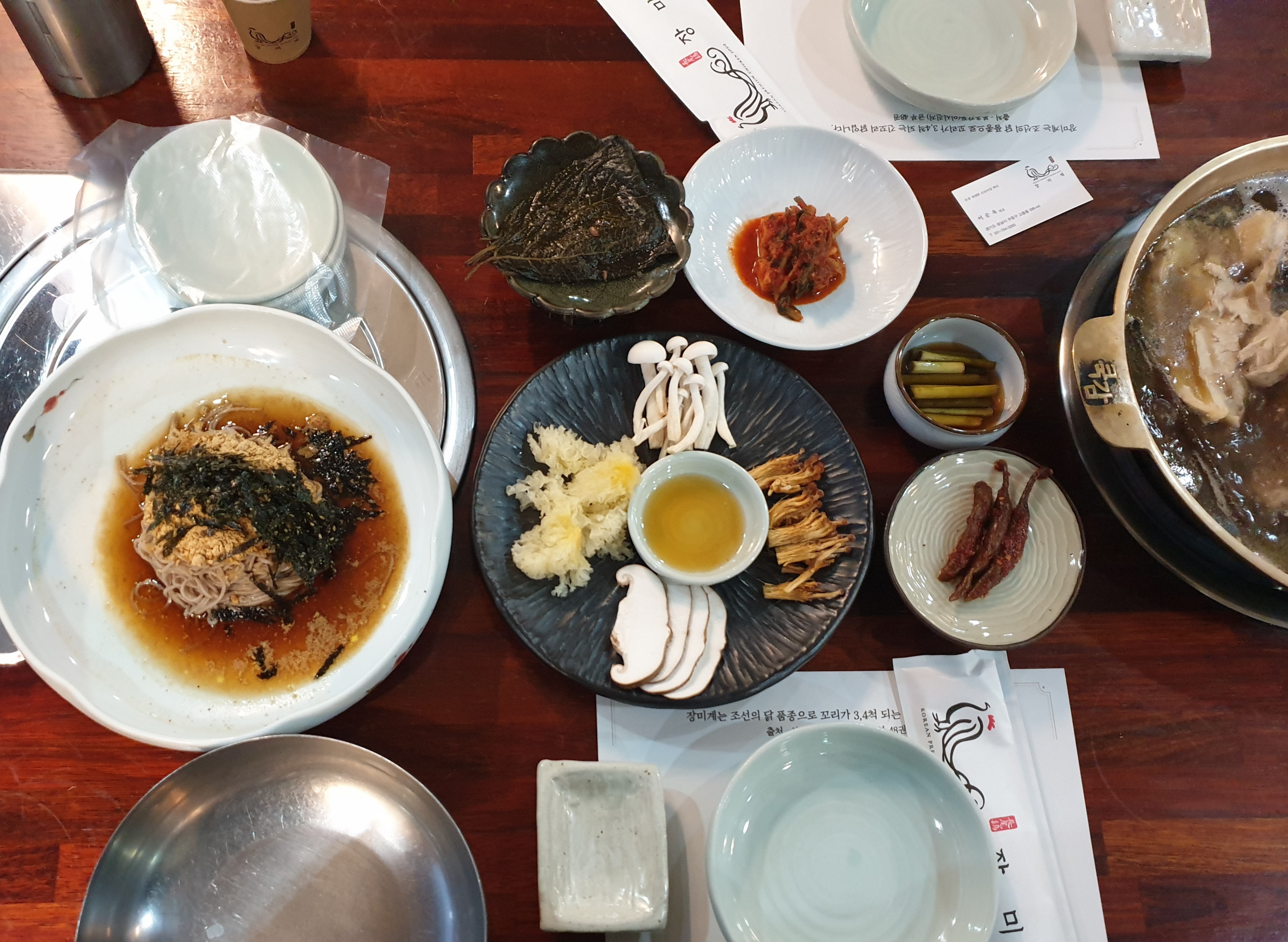 백숙으로 유명한 장미계는 100% 예약제로 운영되는 식당이다. 그래서 지인 두 명과 저녁식사를 위해 오전에 예약을 하고, 메뉴는 식당주인이 추천하는 식당 대표 메뉴인 능이백숙으로 했다. 닭백숙과 죽 그리고 들기름 막국수 등 3명이 먹어도 충분한 양인 푸짐한 메뉴이다.
