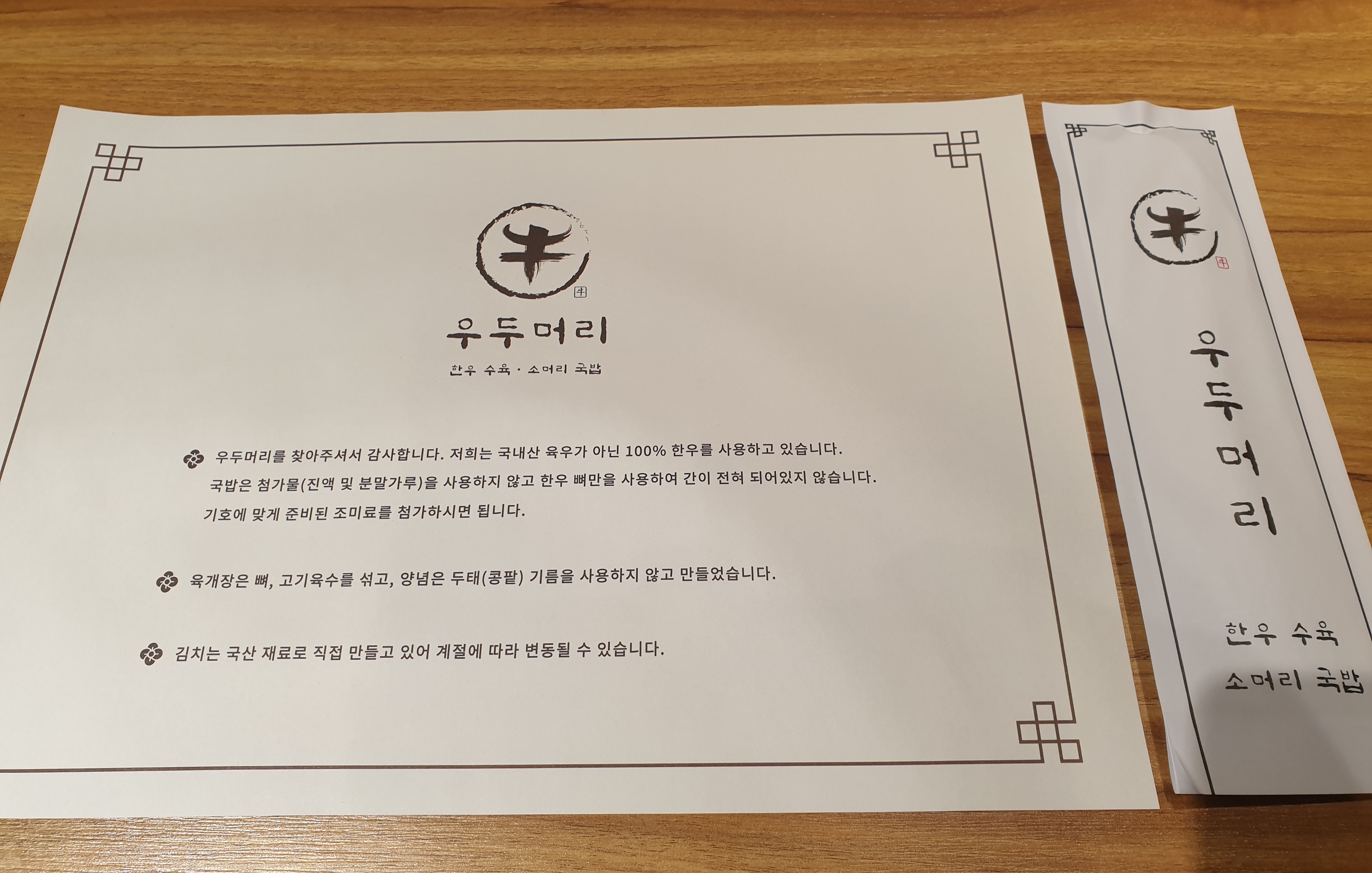 참고로, 우두머리는 국내산 육우가 아닌 100% 한우를 사용하고 있다고 한다. 국밥은 첨가물(진액 및 분말가루)을 사용하지 않고 한우 뼈만을 사용하여 간이 전혀 되어있지 않다. 그러므로 기호에 맞게 준비된 조미료를 첨가해서 먹어야 한다.