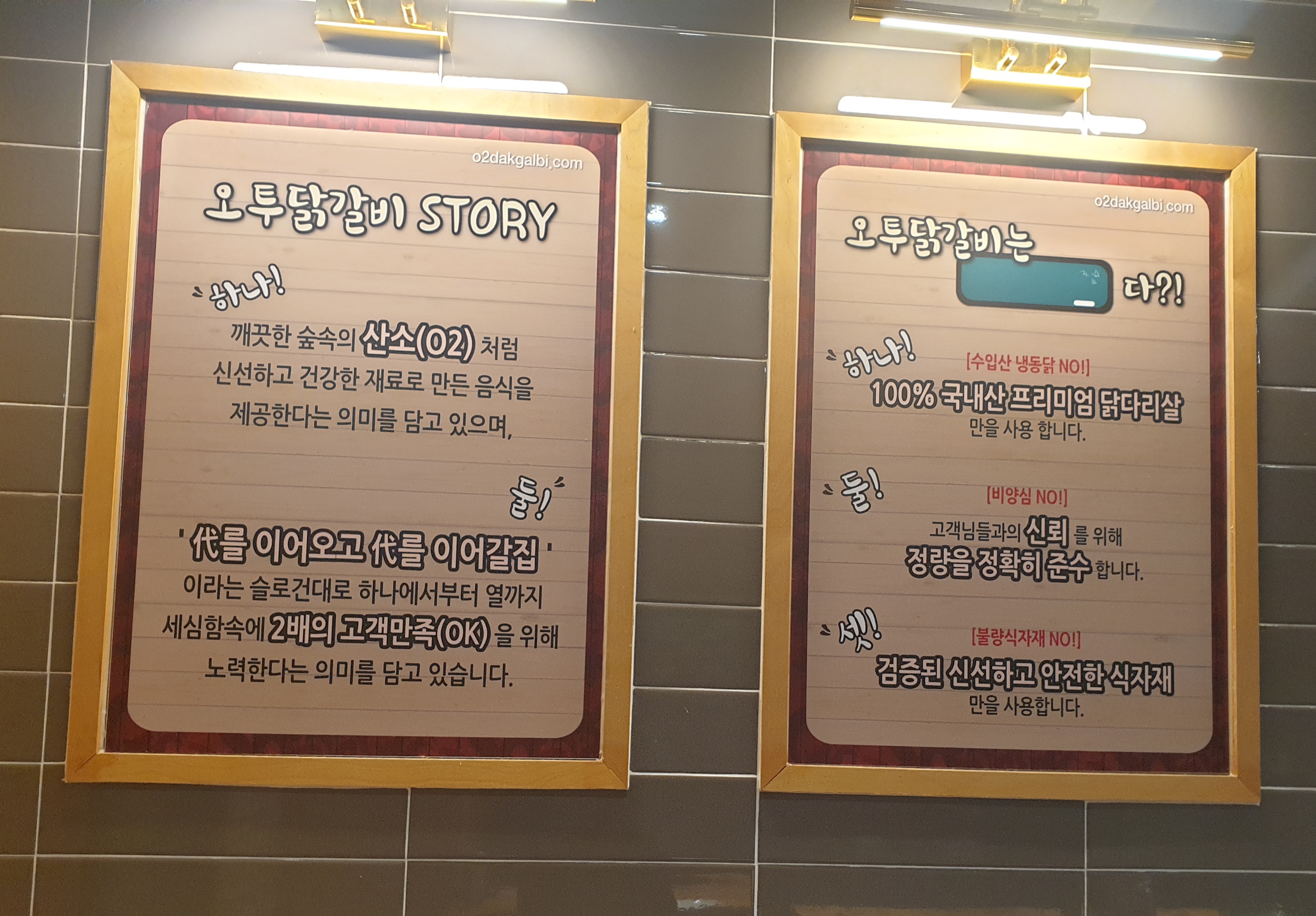 참고로, 오투닭갈비는 깨끗한 숲 속의 산소(O2)처럼 신선하고 건강한 재료로 만든 음식을 제공한다는 의미를 담고 있으며, 대를 이어오고 대를 이어갈 집으로 하나에서 열까지 세심함 속에 2배의 고객만족(OK)을 위해 노력한다는 의미를 담고 있다고 한다.