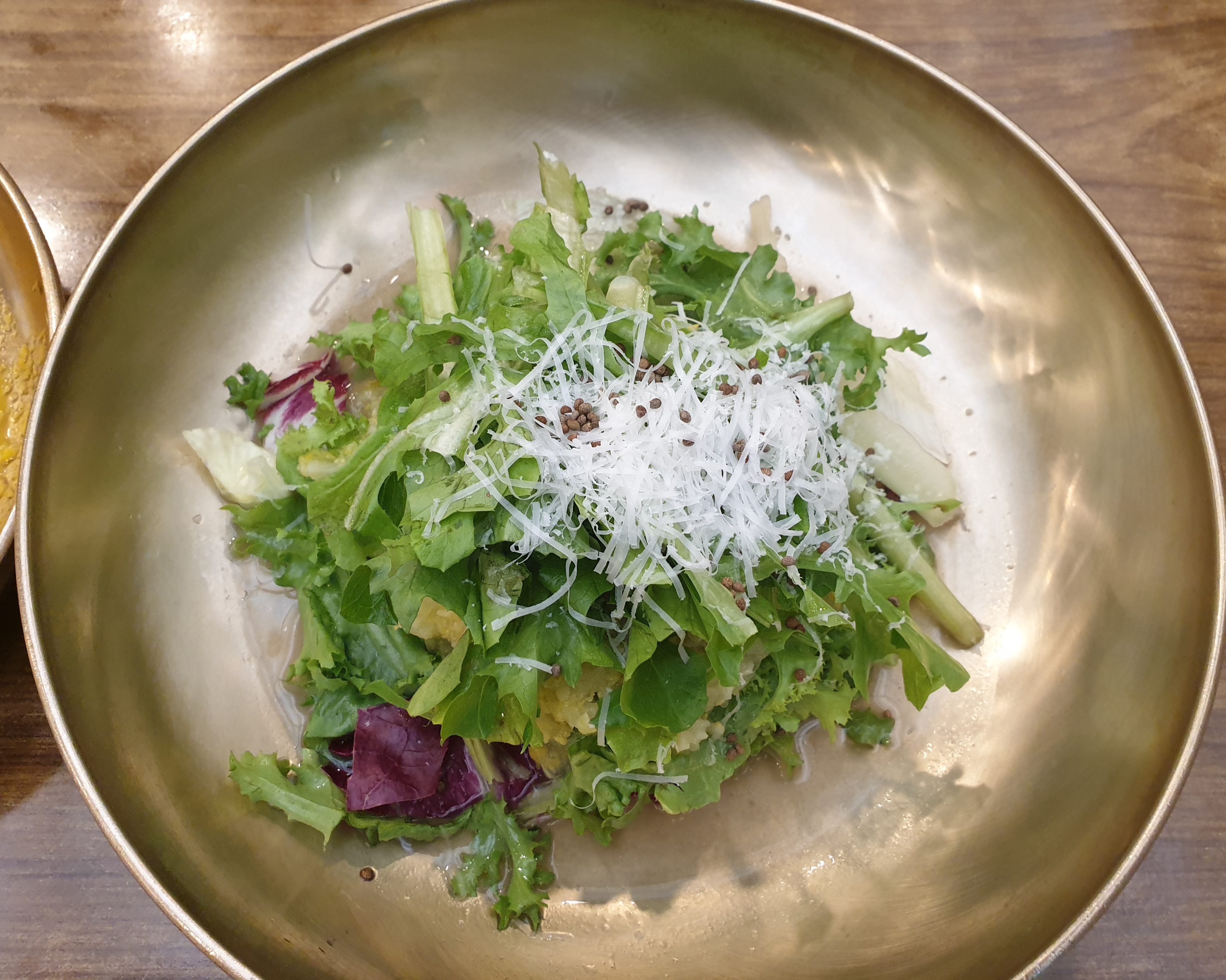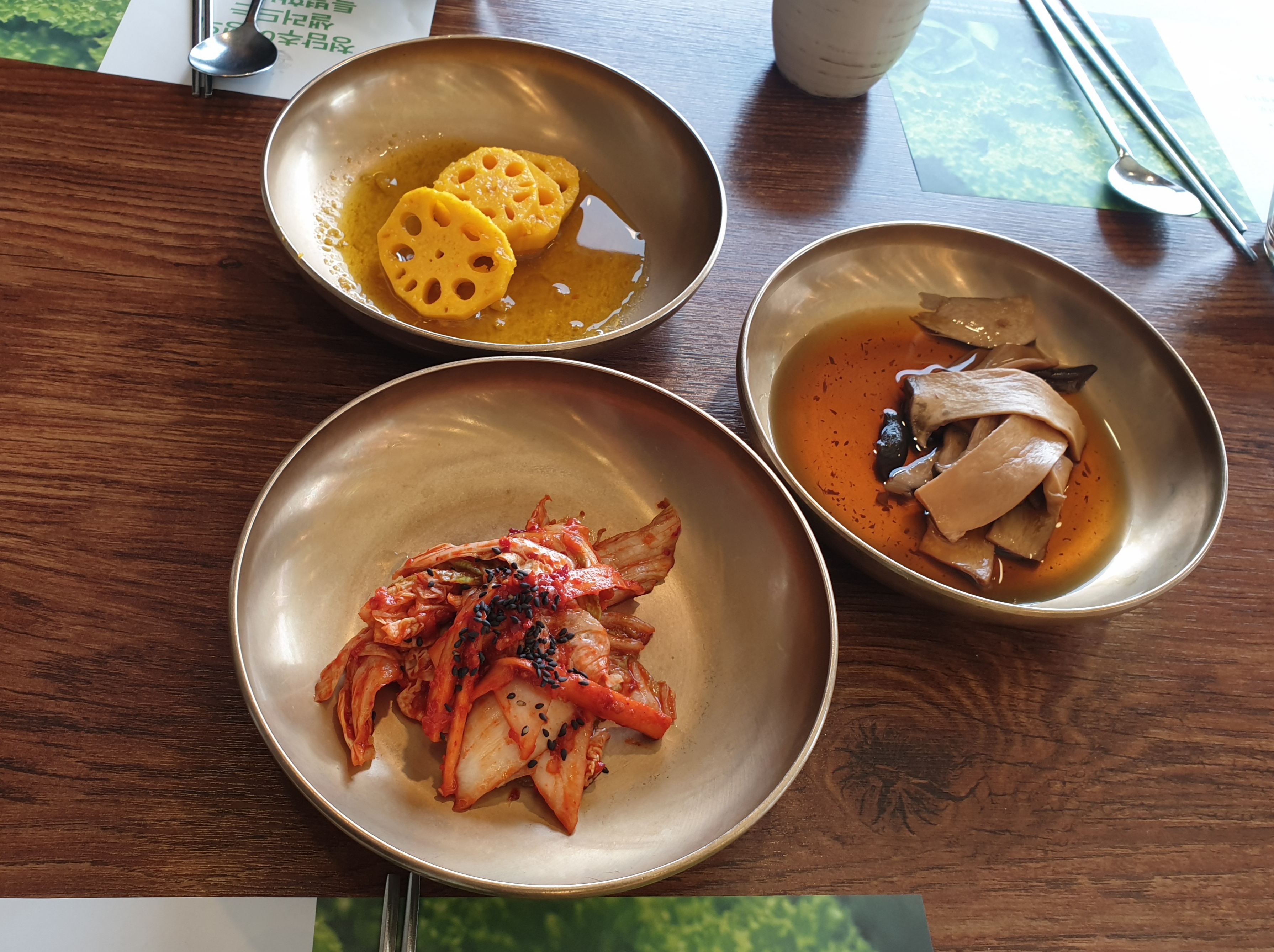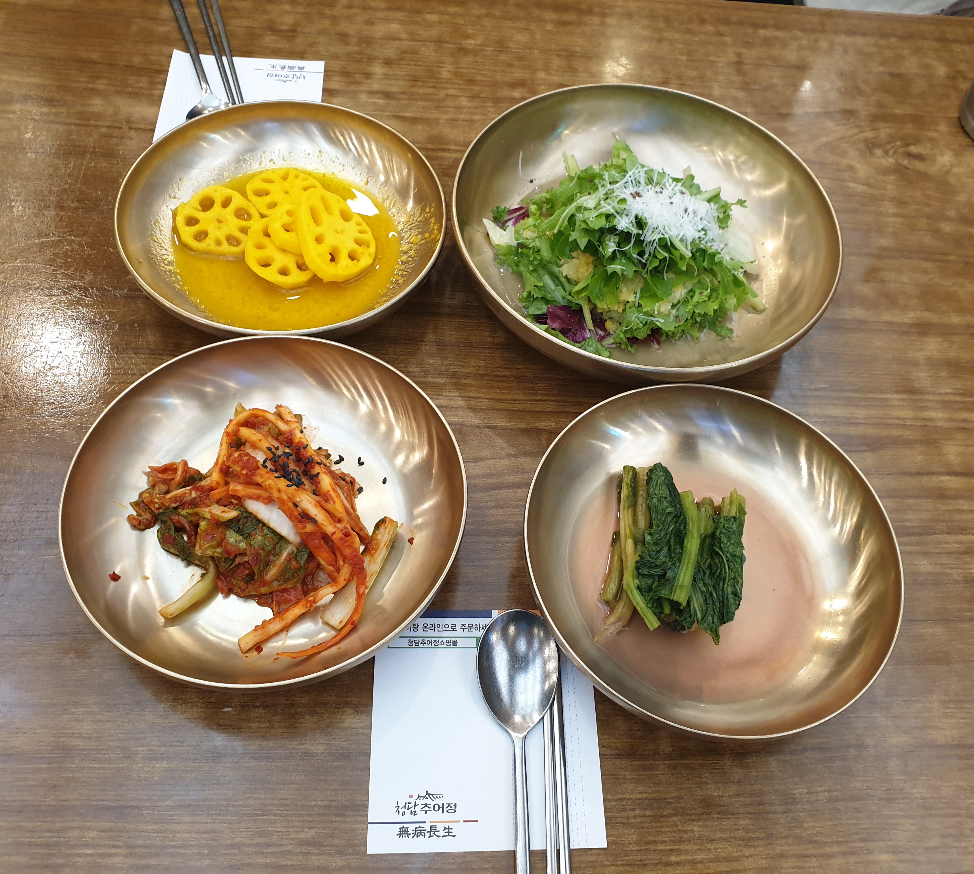 샐러드, 갓김치, 겉절이, 연근이 나온다.