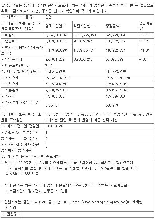 이런 삼성바이오로직스가 지난해인 2023년도에 매출액은 전년 대비 +23.1% 증가한 3조 6,945억원, 영업이익은 전년 대비 +13.2% 증가한 1조 1,136억원, 당기순이익은 전년 대비 +7.5% 증가한 8,576억을 달성하였다고 공시하였으며, 특히 영업이익은 사상 최대 실적을 기록했다고 한다.