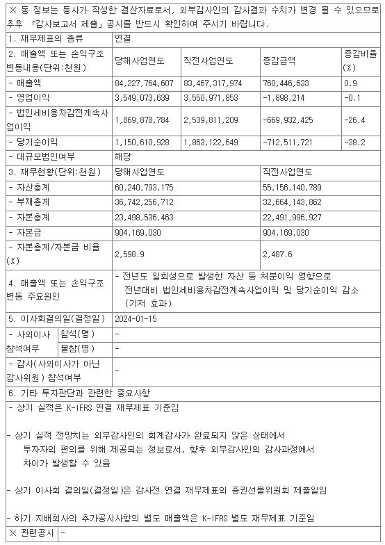 - 매출액 : 84조 2,277억원 (전년 대비 +0.9% 증가)