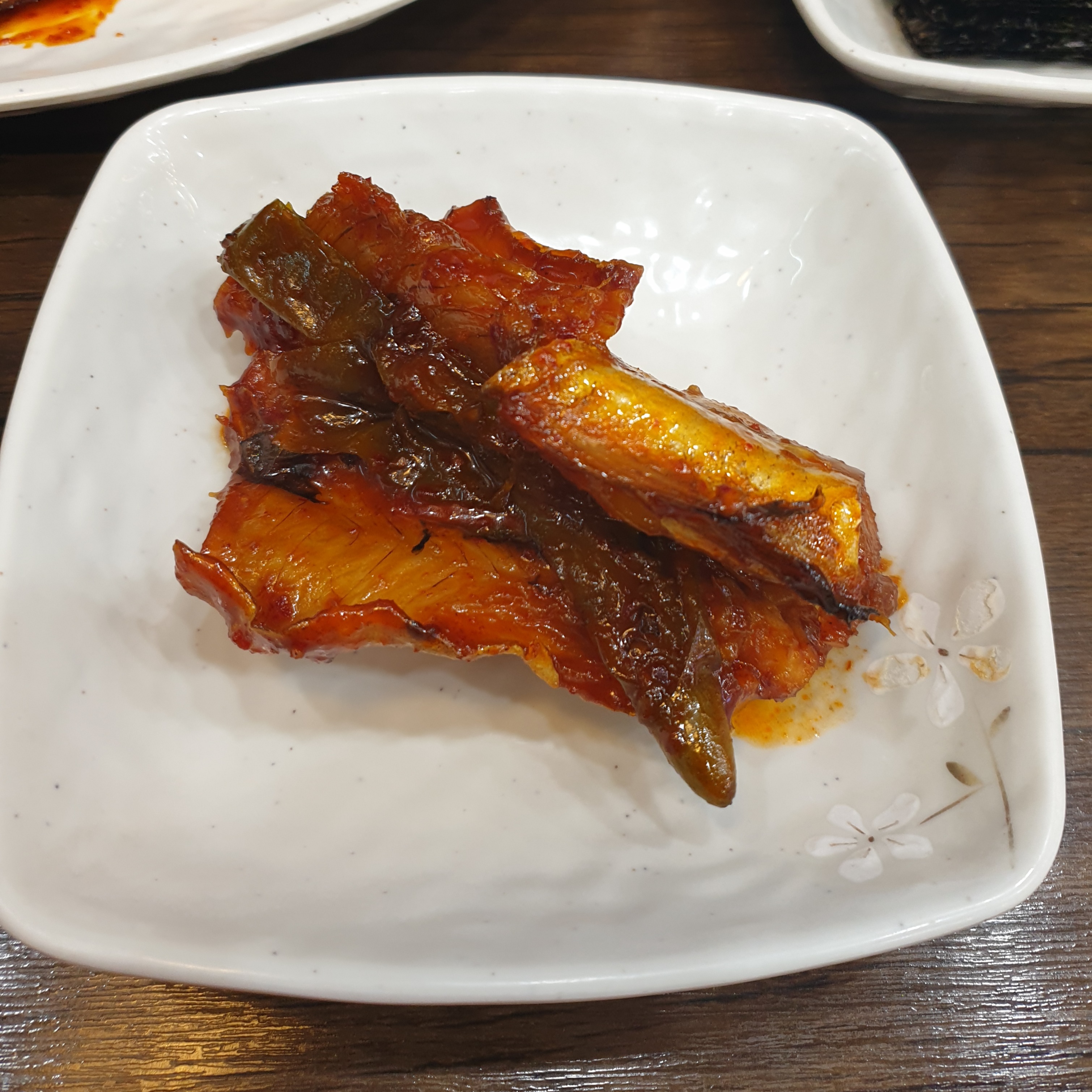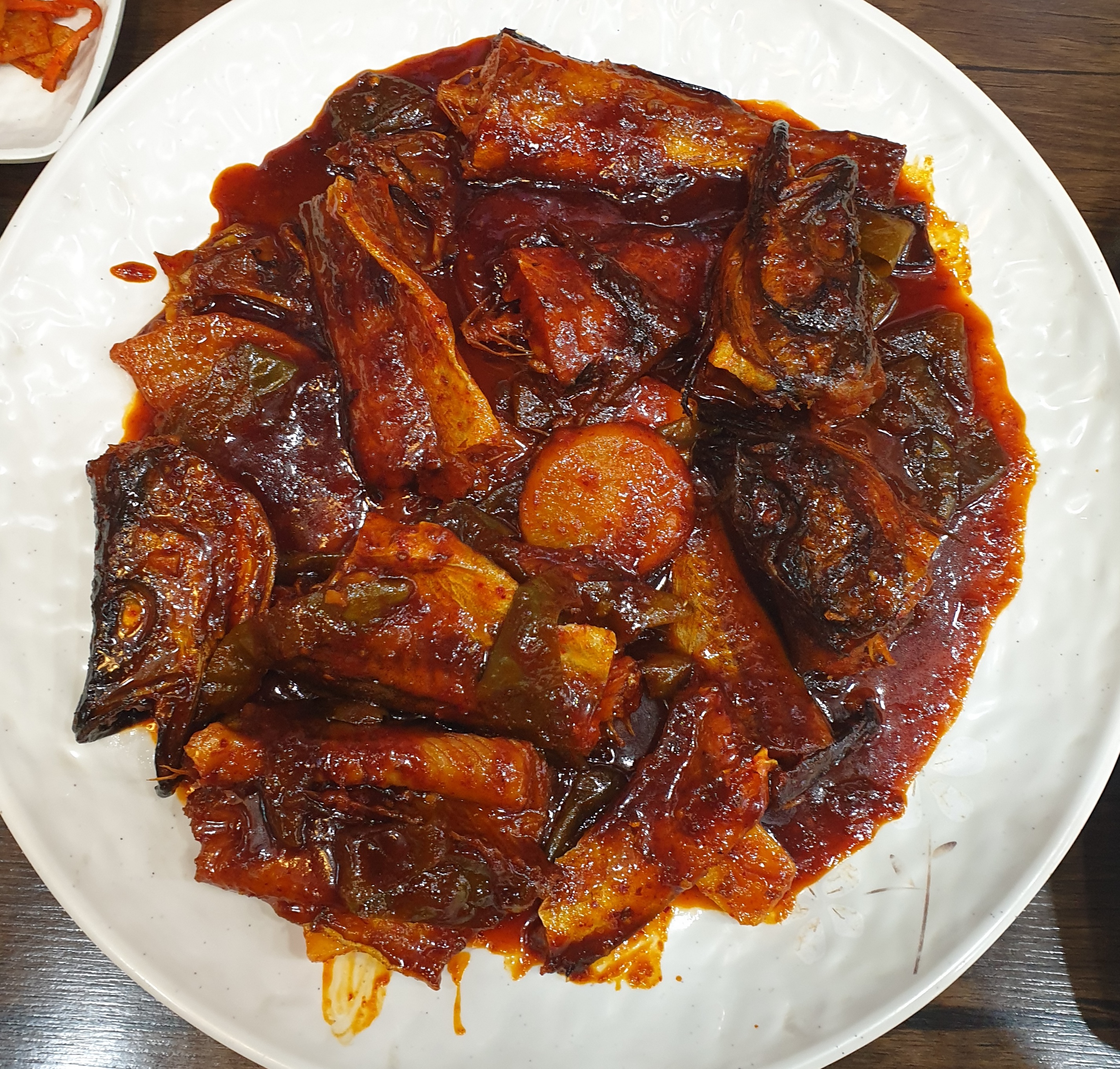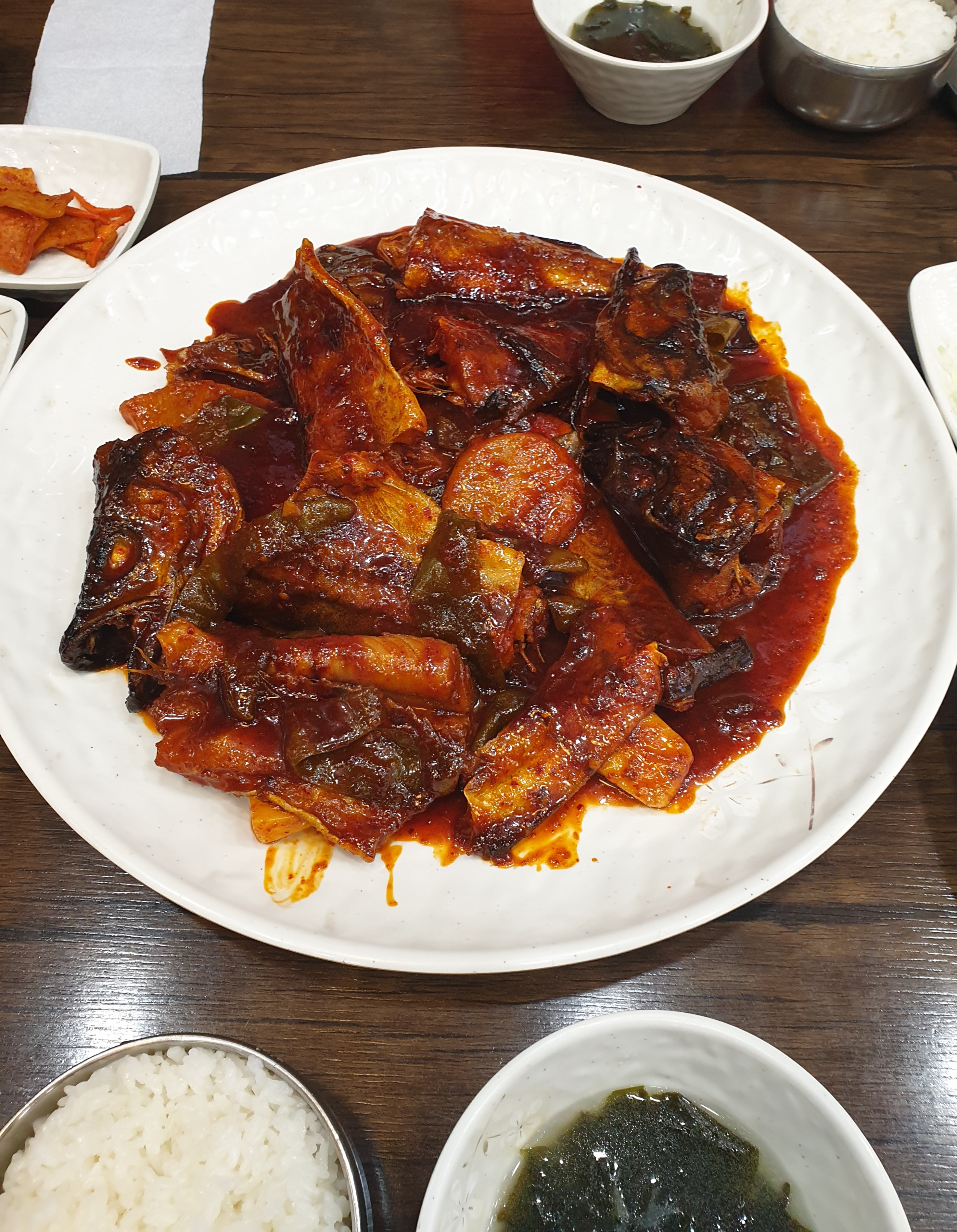 메인 메뉴인 코다리찜은 매콤한 양념이 골고루 잘 배여 생선살이 탱탱하면서도 부드럽고 쫀득쫀득하며, 양념에 배인 떡도 쫄깃쫄깃 맛있다.
