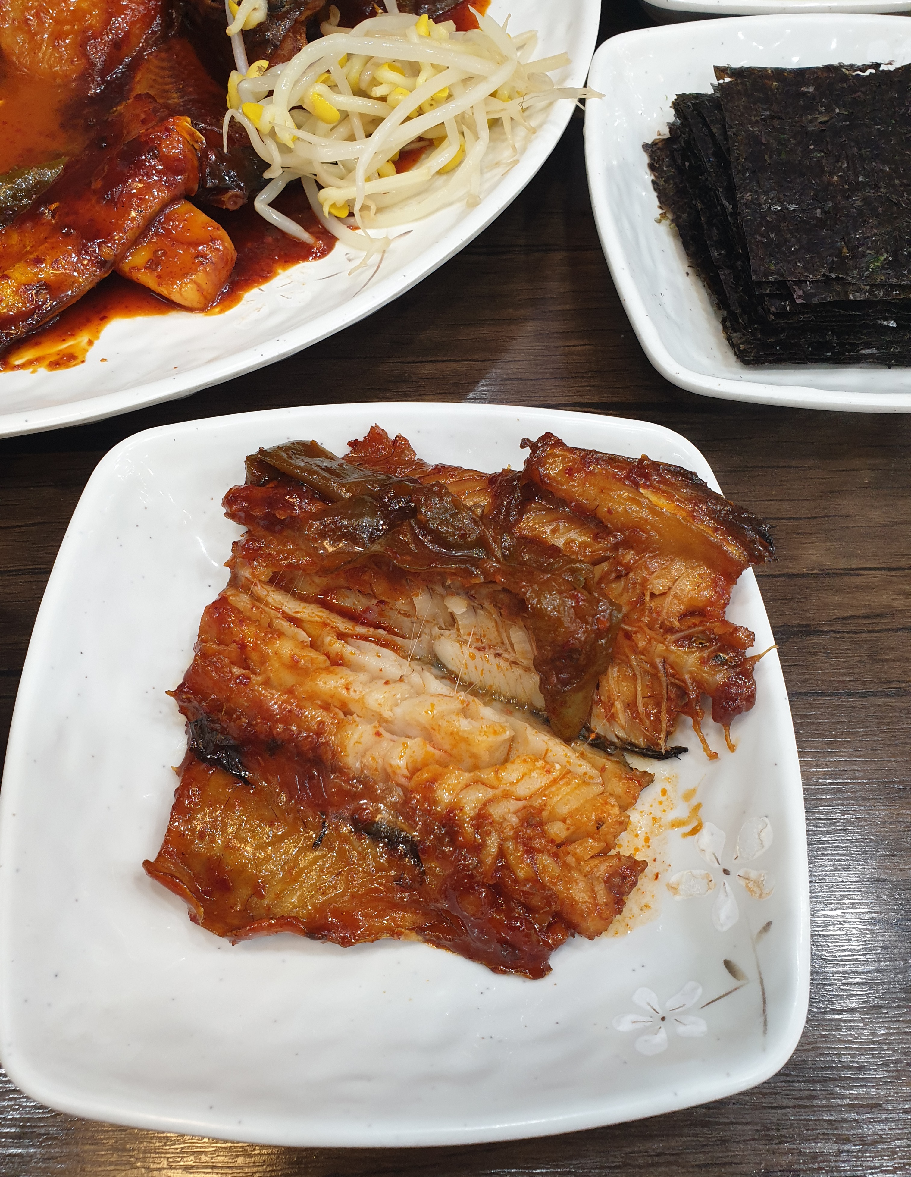 매콤한 코다리살을 김에 싸먹으면 매운맛이 중화되는 또 다른 맛을 음미할 수 있다.