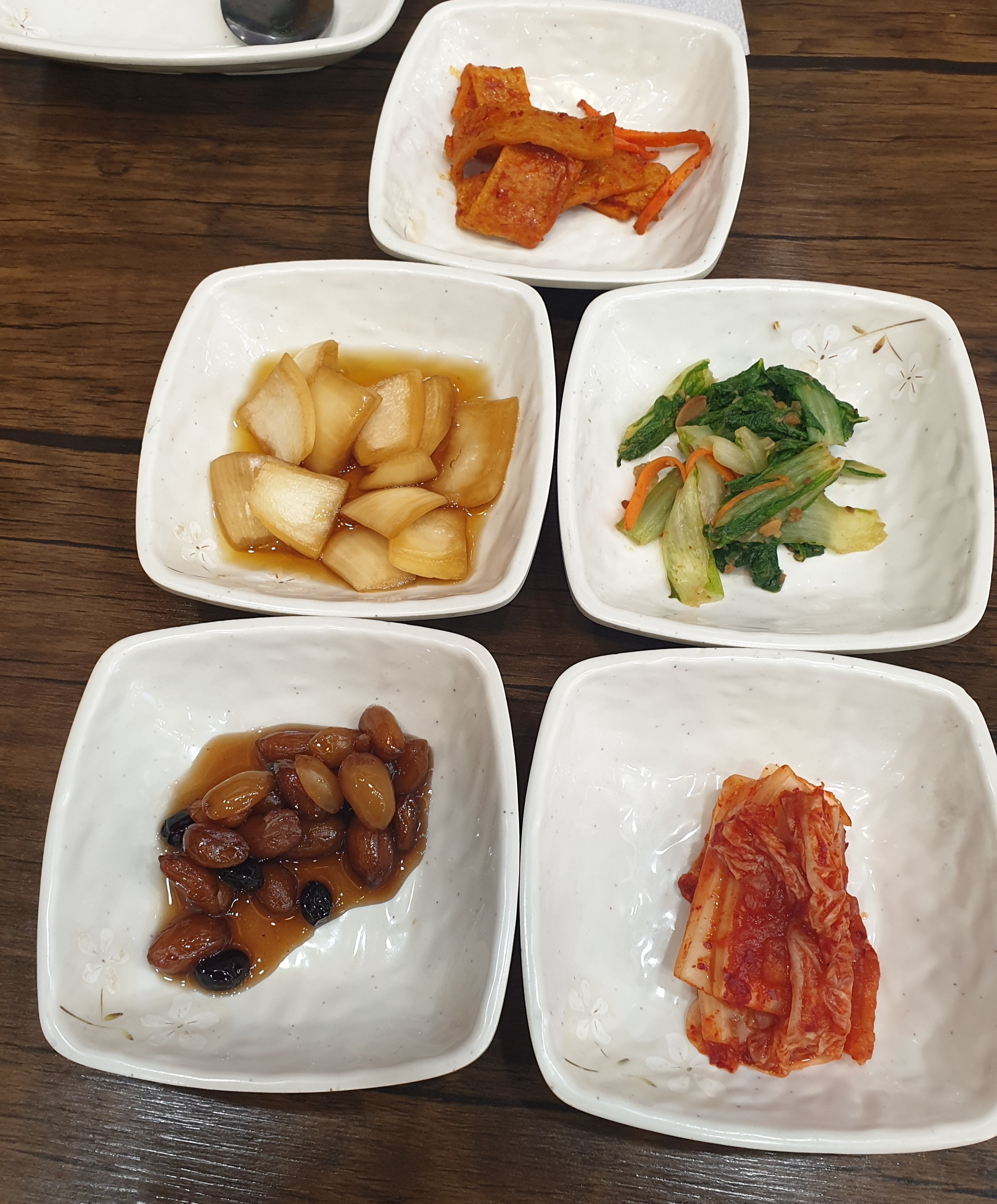밑반찬으로 나온 김치, 어묵볶음, 양파조림, 콩조림, 청경채무침으로 깔끔하게 나온다.