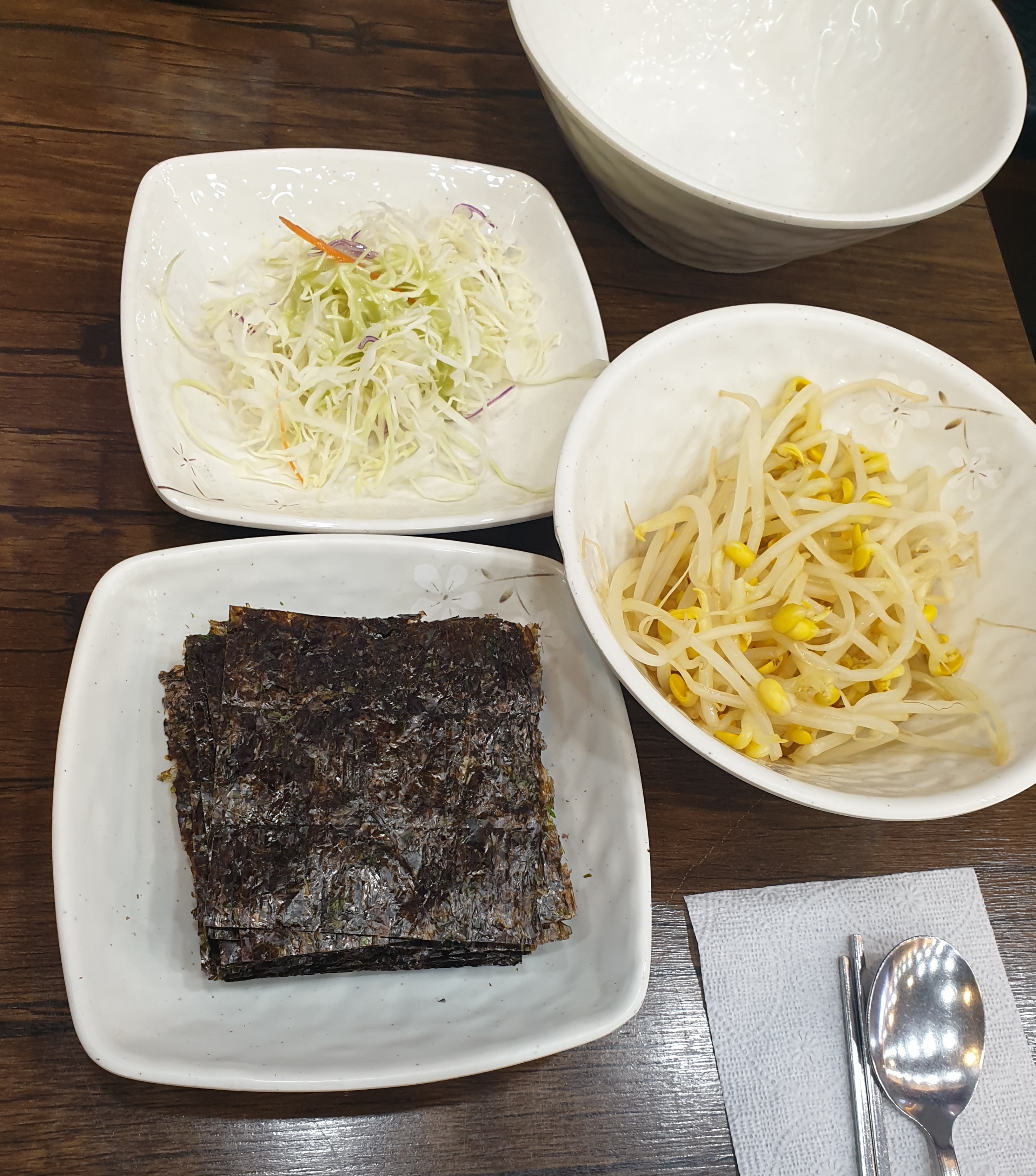 밑반찬으로 나온 양배추샐러드, 콩나물, 김