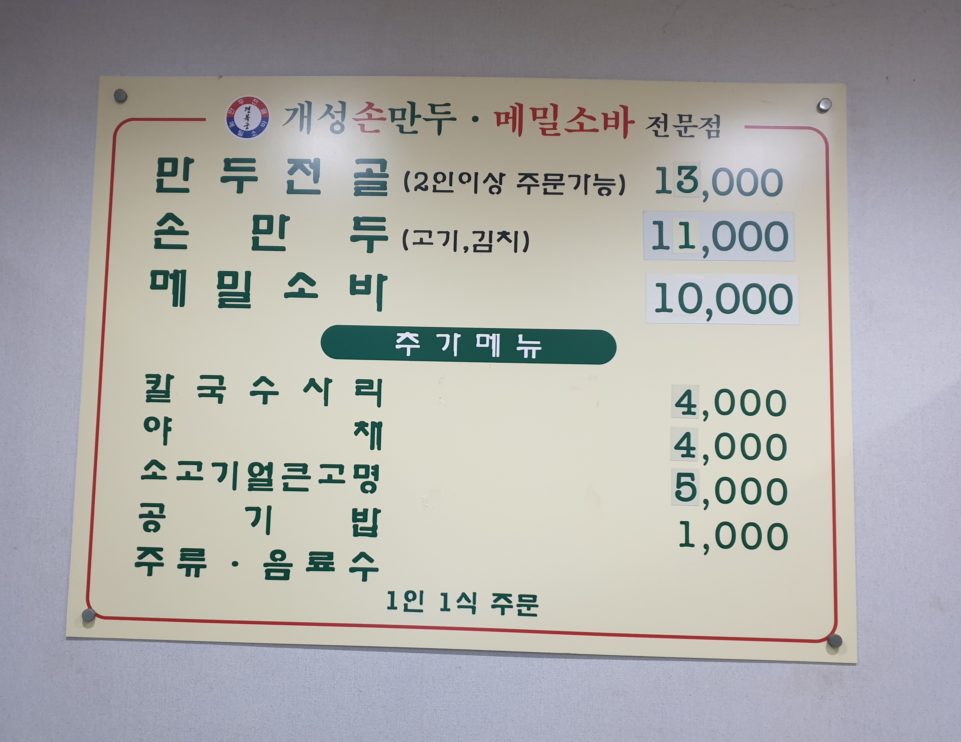 개성손만두와 메밀소바 전문점으로 단골손님들로 인해 늘 붐빈다. 주차가 쉽지 않을 정도로 식당앞 주차장은 늘 만차다.