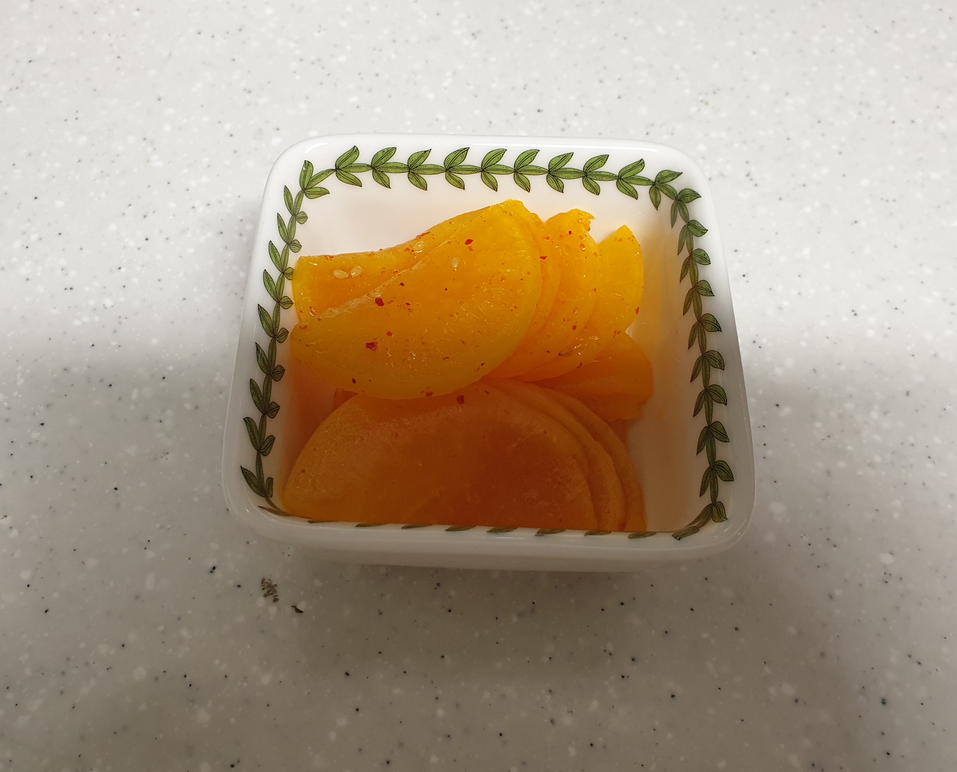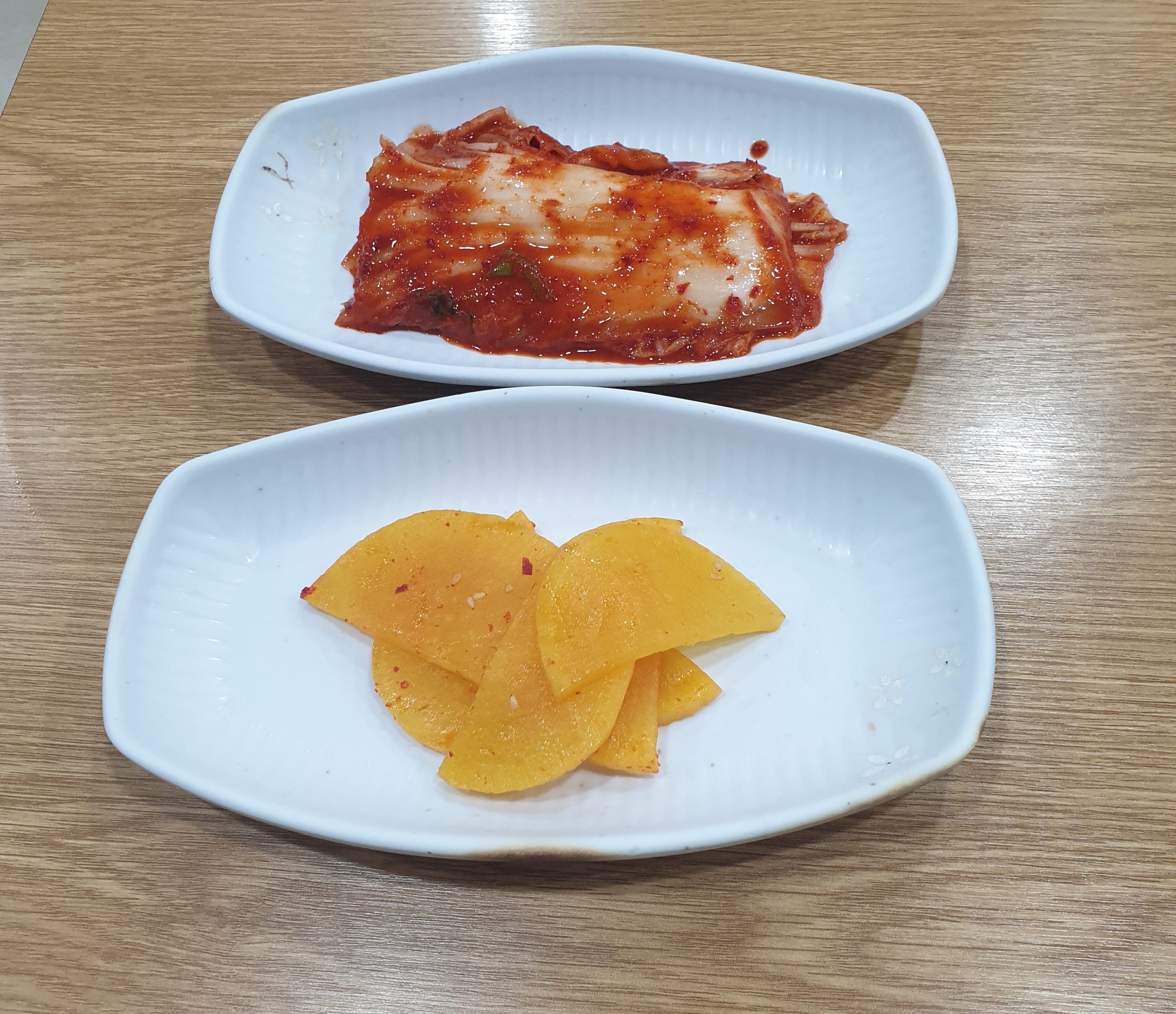 밑반찬으로 직접 담근 김치와 단무지가 제공되며, 부족하면 셀프코너에서 가져다 먹으면 된다.