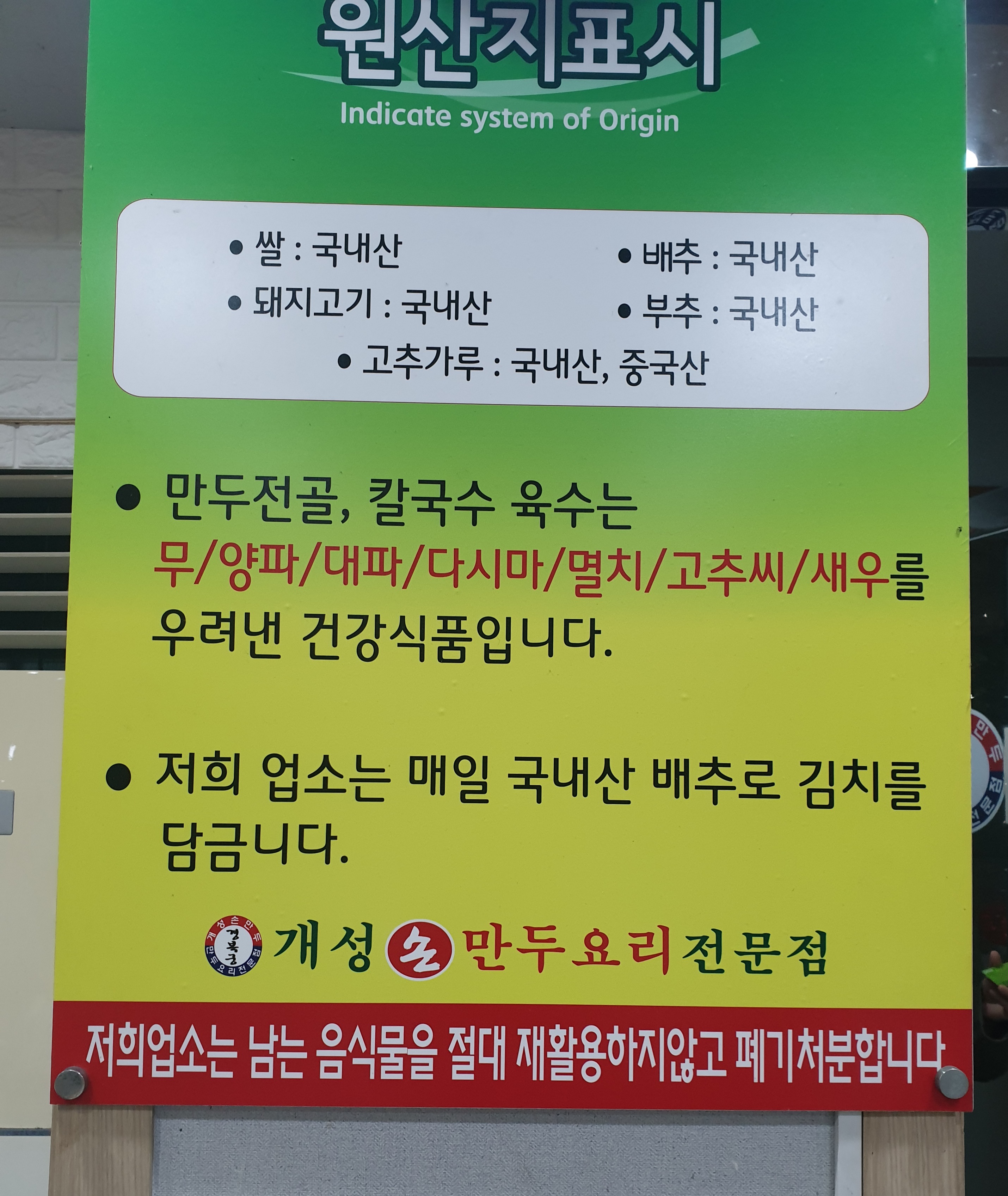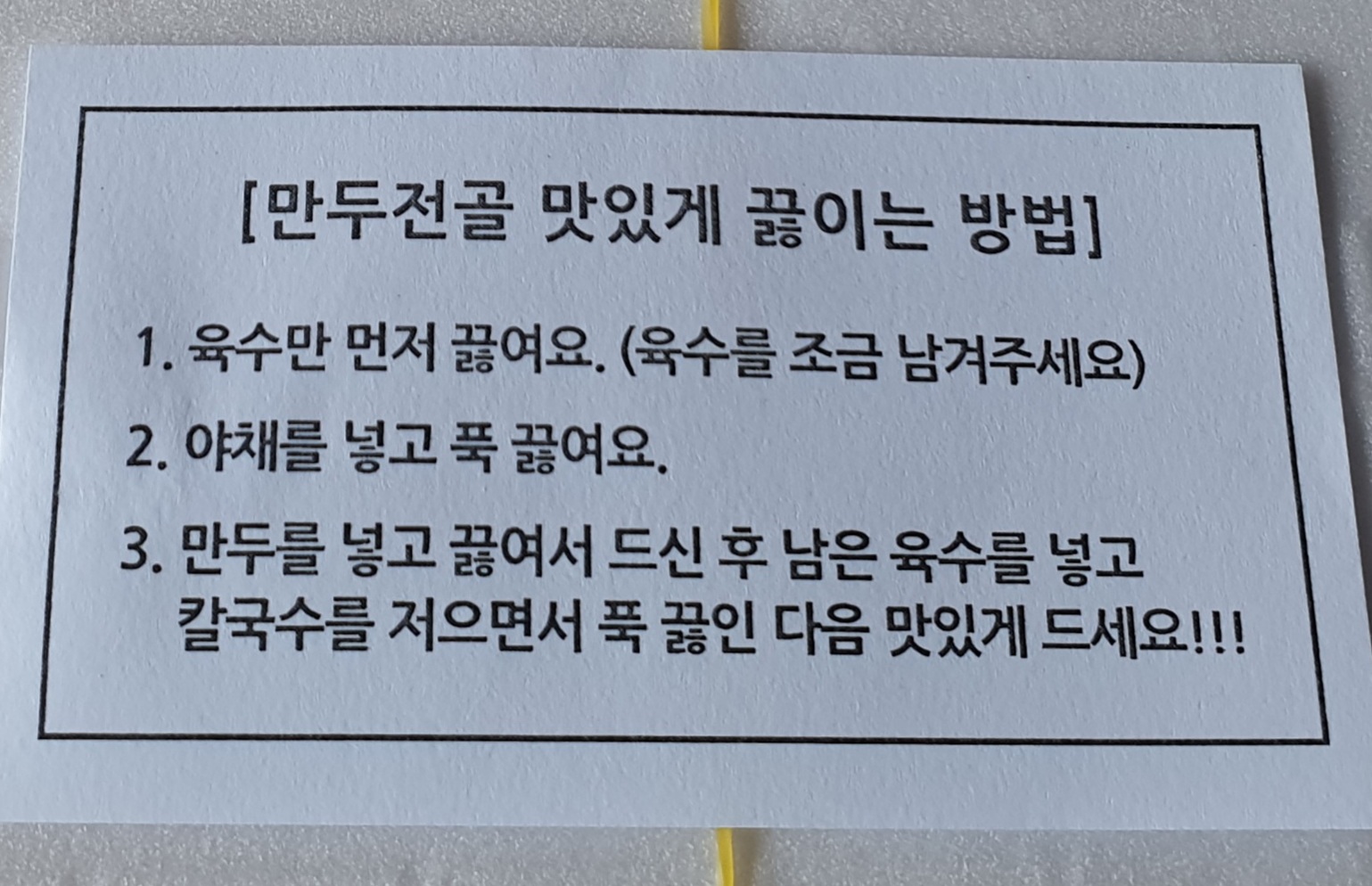 만두전골과 칼국수 육수는 무, 양파, 대파, 다시마, 멸치, 고추씨, 새우를 우려낸 건강식품이라고 쓰여있다.