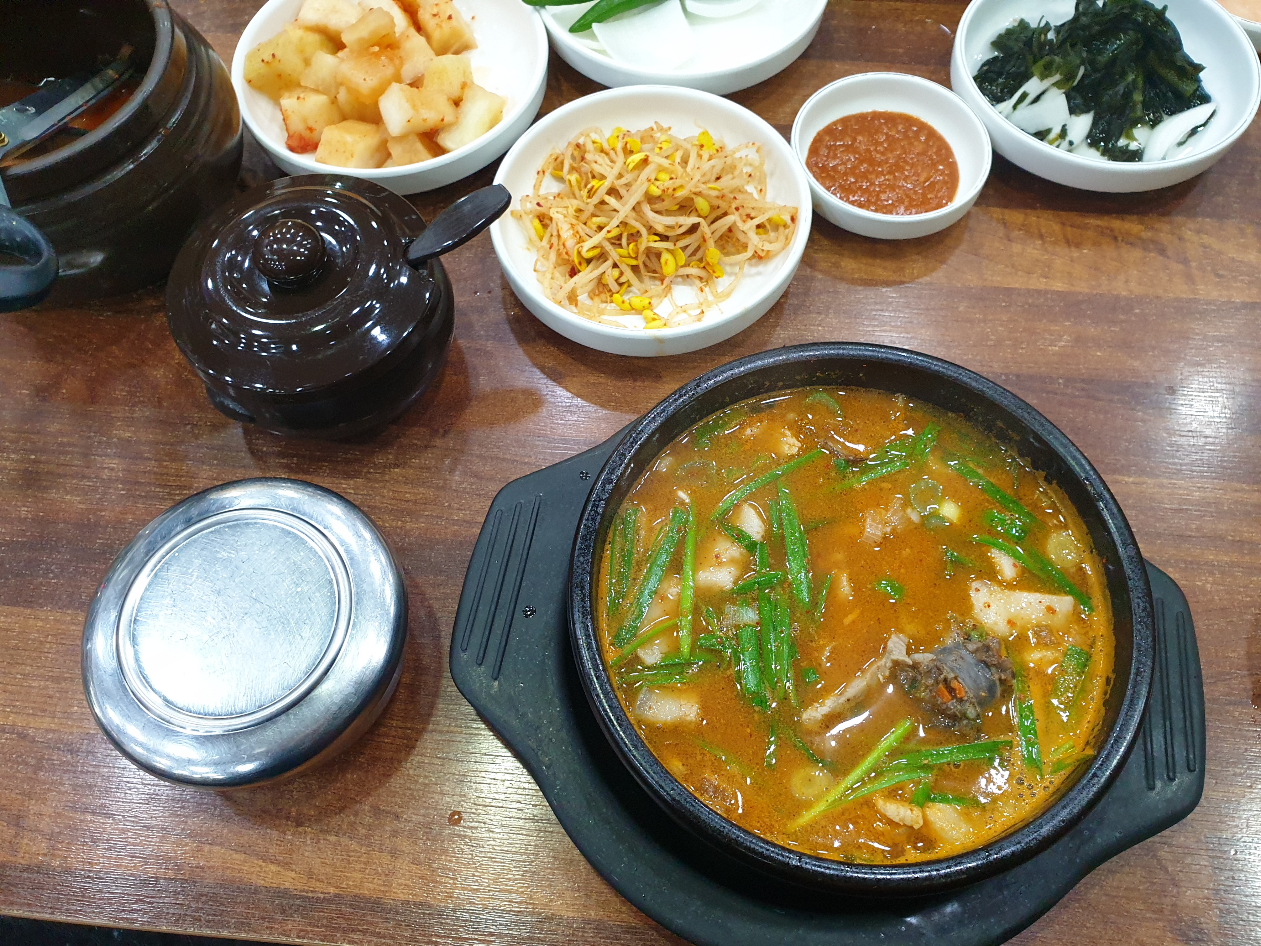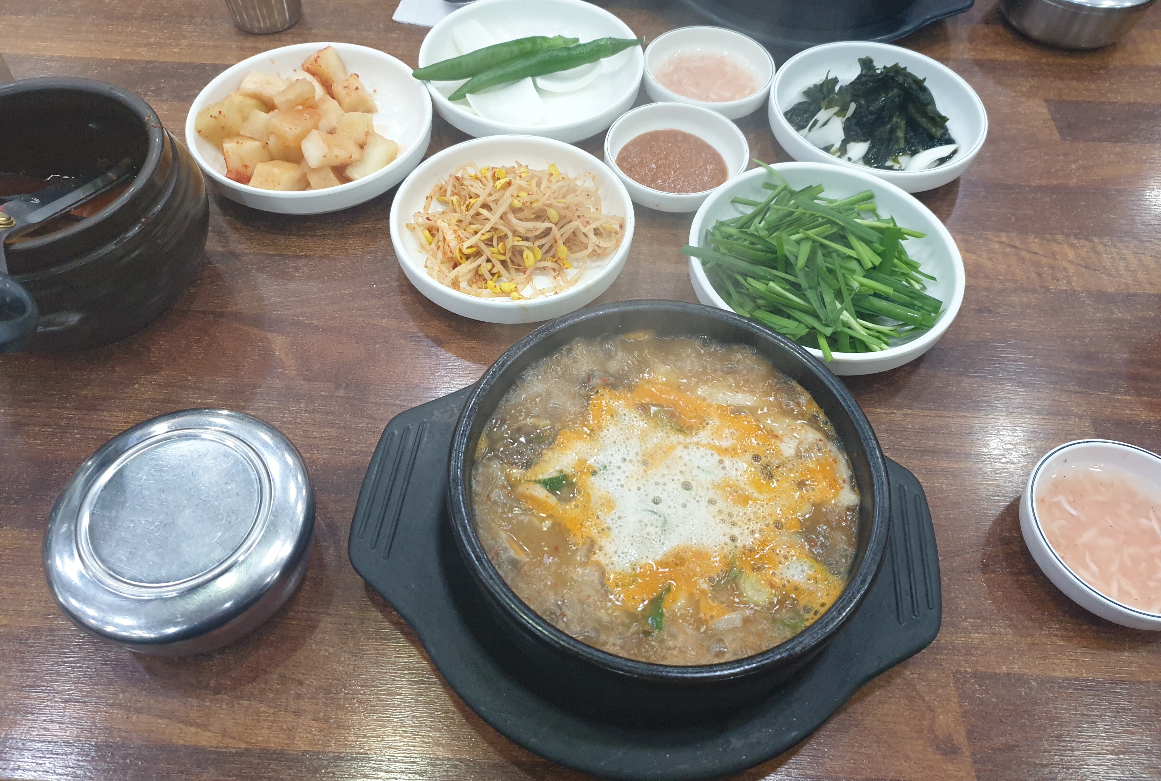 펄펄 끓인 상태에서 대파와 양념장이 얹힌 상태의 순댓국이 나온다. 모자라는 간은 준비된 새우젓으로 하면 된다.