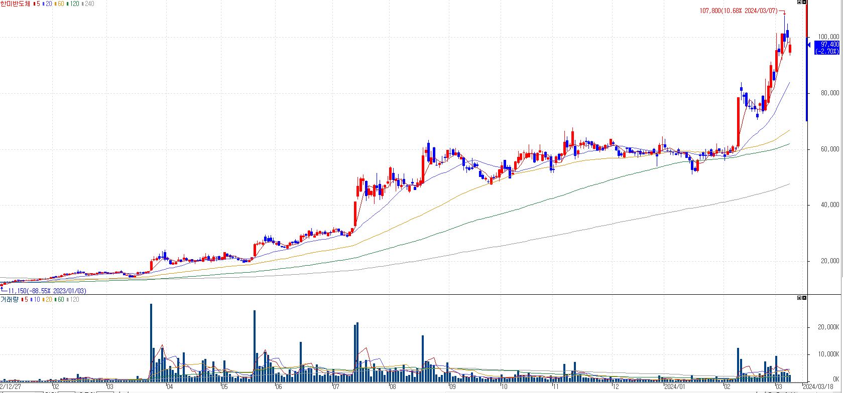 인공지능(AI)와 관련하여 광대역폭메모리(HBM) 관련주들이 폭등하고 있는데, 광대역폭메모리(HBM) 대장주인 한미반도체의 시세도 폭등 중에 있다.