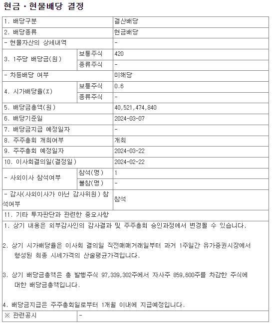 1년에 한 번만 배당하는 결산배당 방식인데 2023년부터 연말 배당에서 연초배당으로 변경되어 올해 배당기준일이 2024년 3월 7일로 결정되었다. 주당 420원, 총 407억원 규모의 창사 이래 최대 현금배당 계획을 발표하면서 앞으로 배당성향을 계속 확대해 나갈 것이라고 한다.