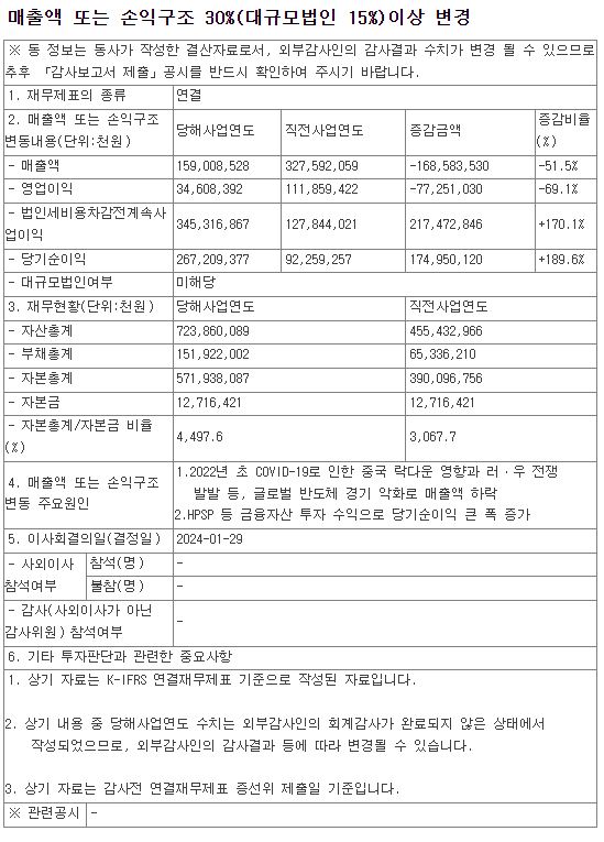 한편, HPSP 등 금융자산 투자 수익으로 당기순이익은 큰 폭 증가하였다고 공시하였다.