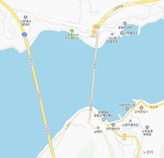 진주나 하동을 지나 이순신장군의 마지막전투 현장인 노량앞바다에 다다르게 되면 남해도가 바로 지척에 보이며, 육지와 남해도를 잇는 우리나라 최초의 현수교인 남해대교(현재 제2의 남해대교인 노량대교 신설)를 만나게 된다.