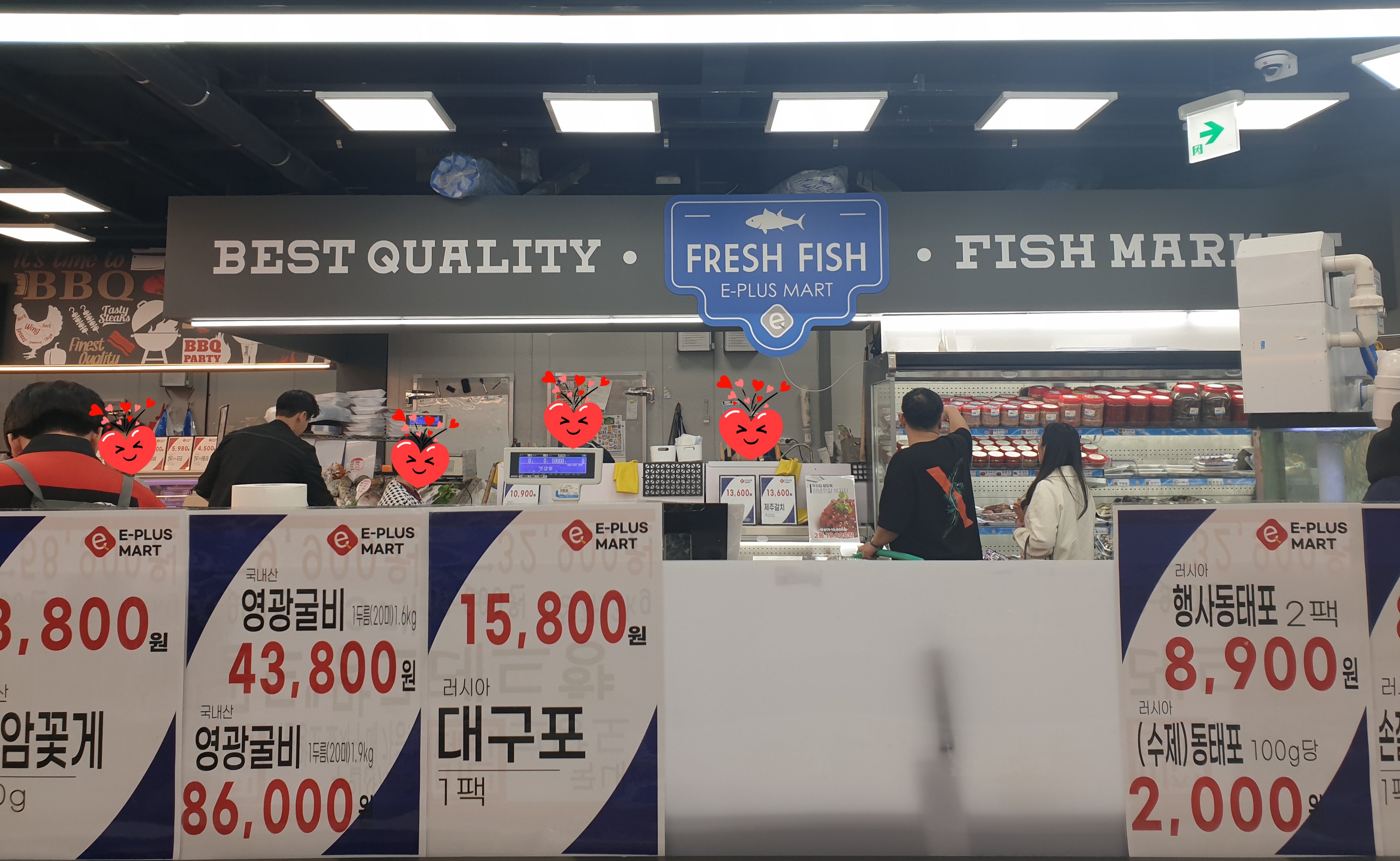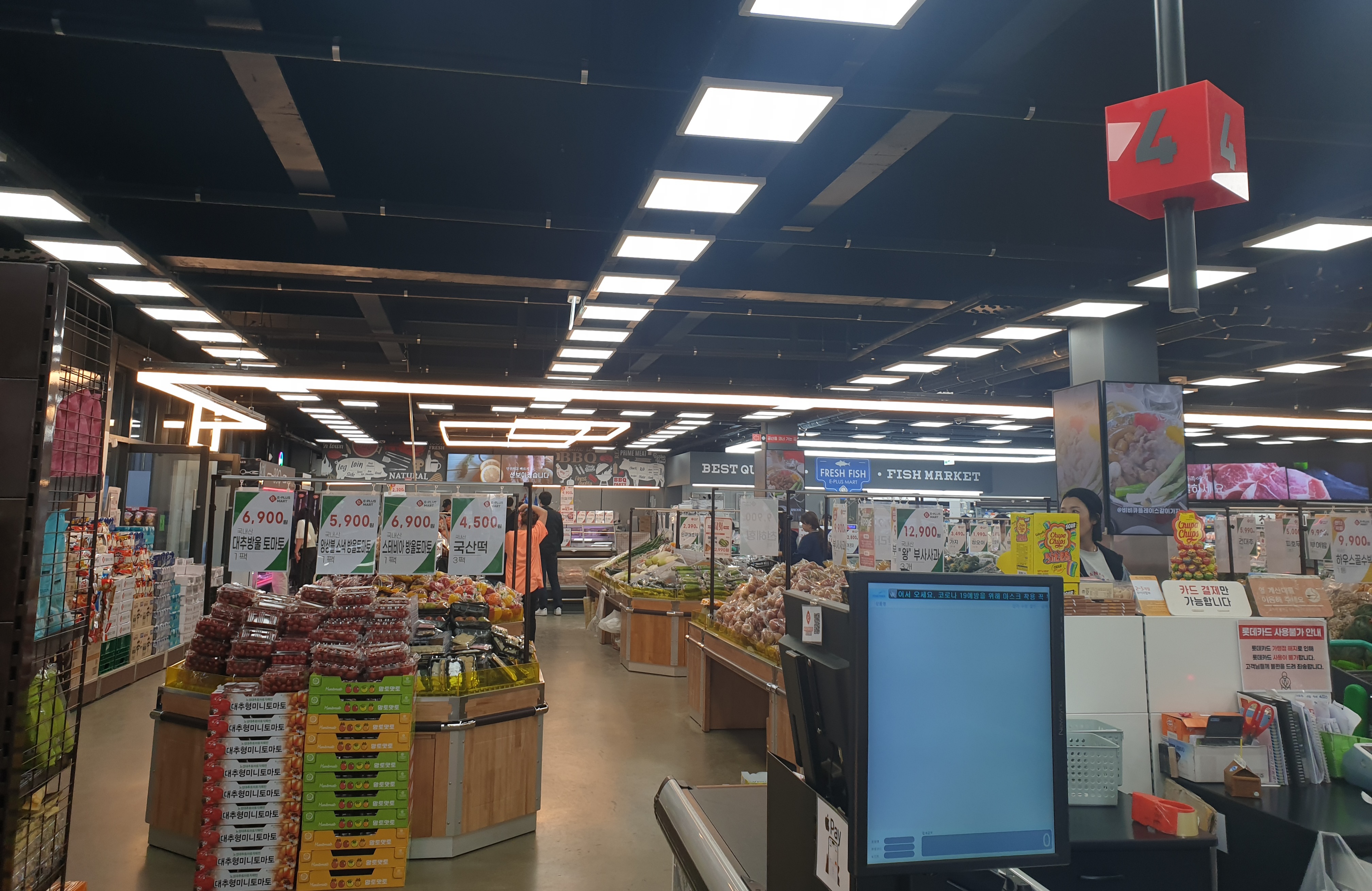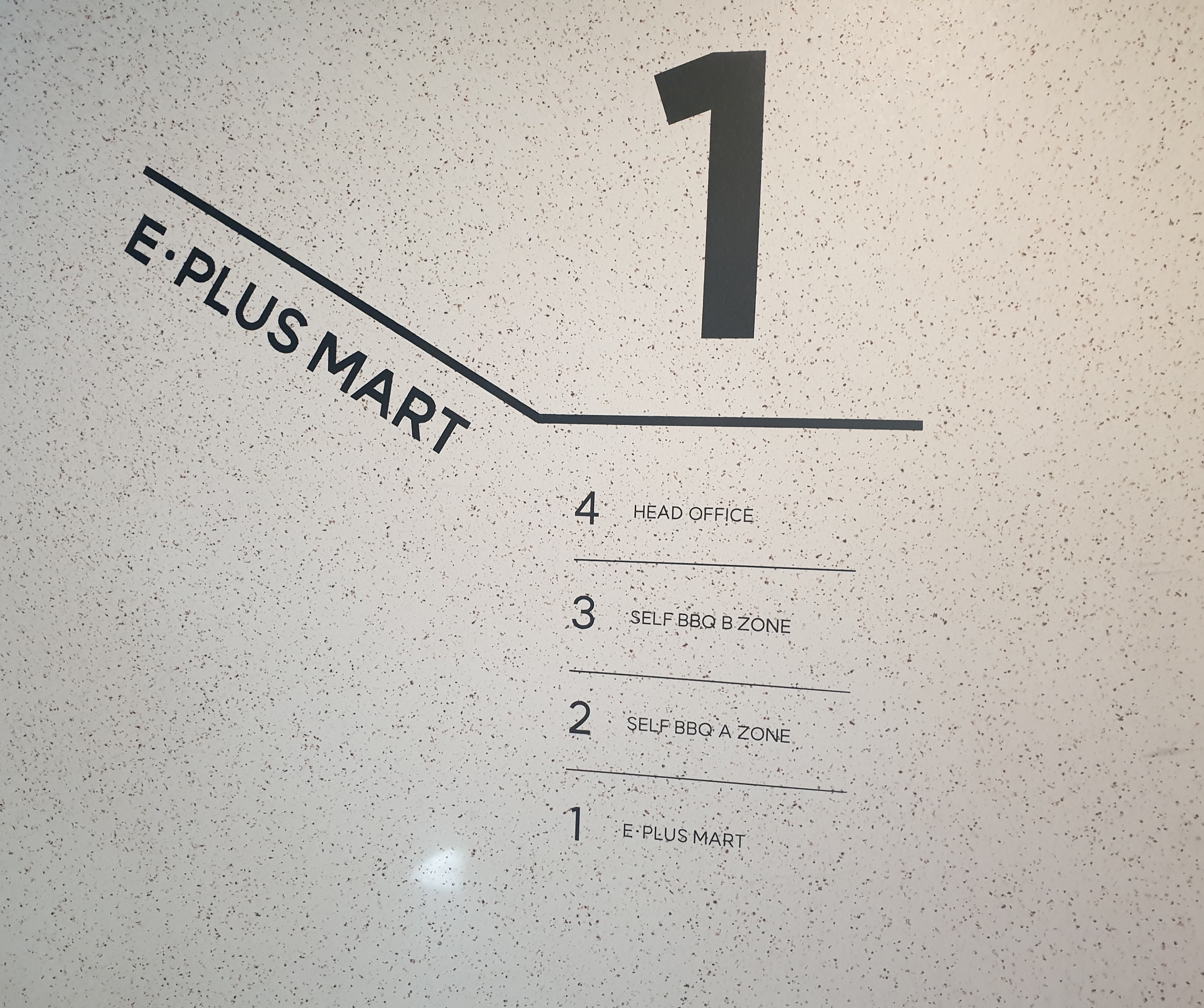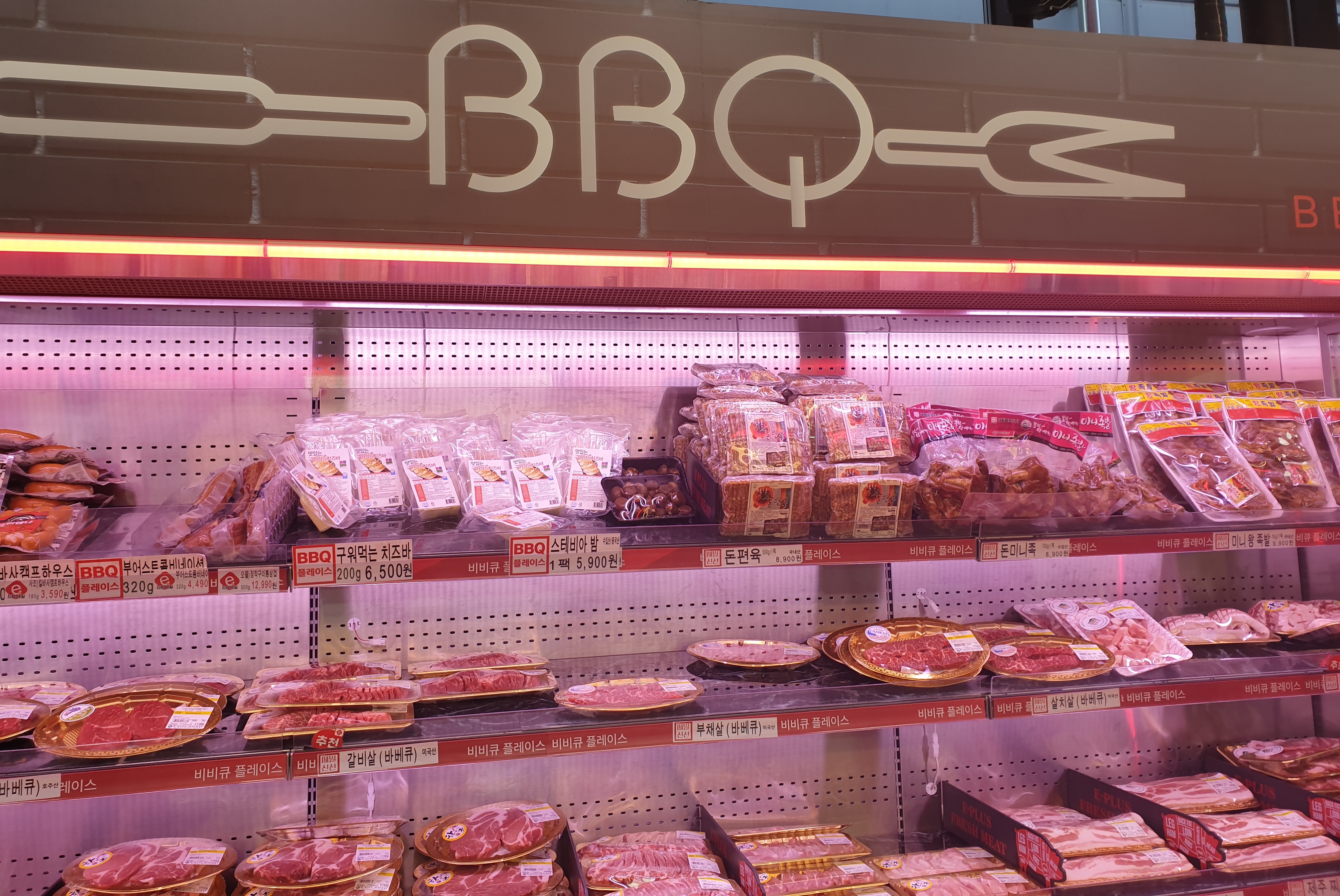 다양한 식재료를 판매하는 1층 이플러스마트(E-PLUS FOODS MARKET)에서 원하는 식자재를 먼저 구매하여야 하는데, 우리 일행은 상추 등 채소와 쌈장 그리고 삼겹살, 목살, 소시지, 새우, 가래떡, 햇반 등을 구입하였다.