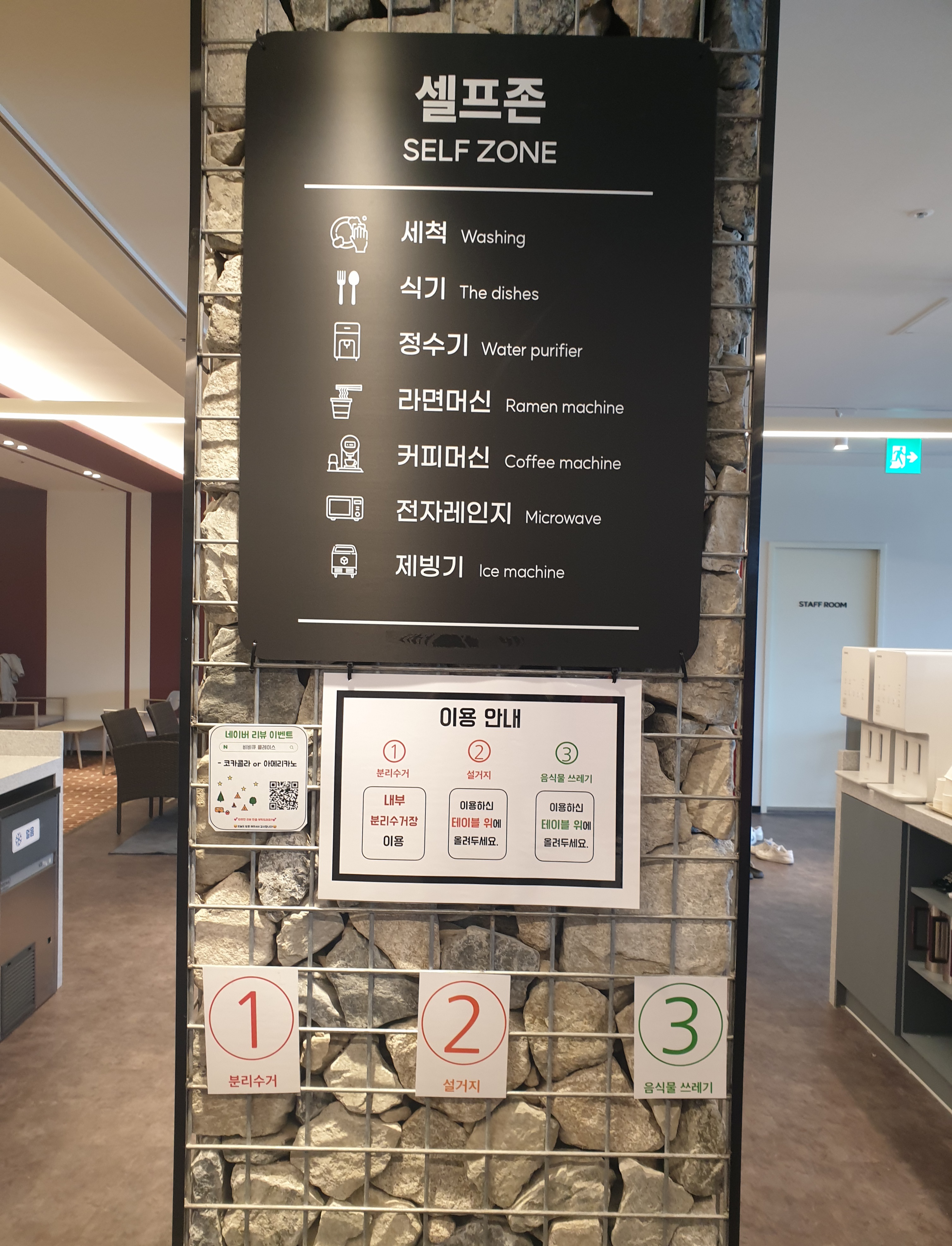 식기, 소금 및 후추 등도 준비되어 있기에 따로 구입할 필요가 없으며, 1층에서 구매 못한 제품이 있다면 2층매장에서 라면, 음료, 김치, 쌈장, 햇반 등을 구입할 수 있다.