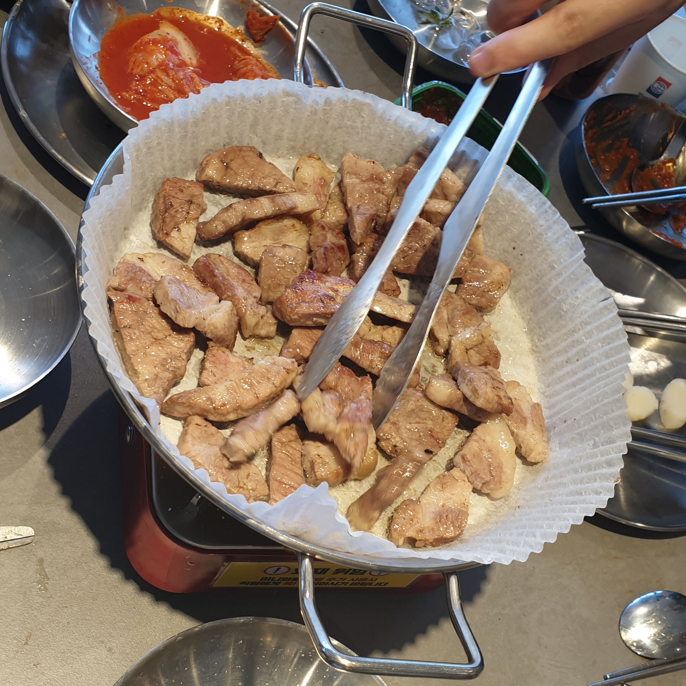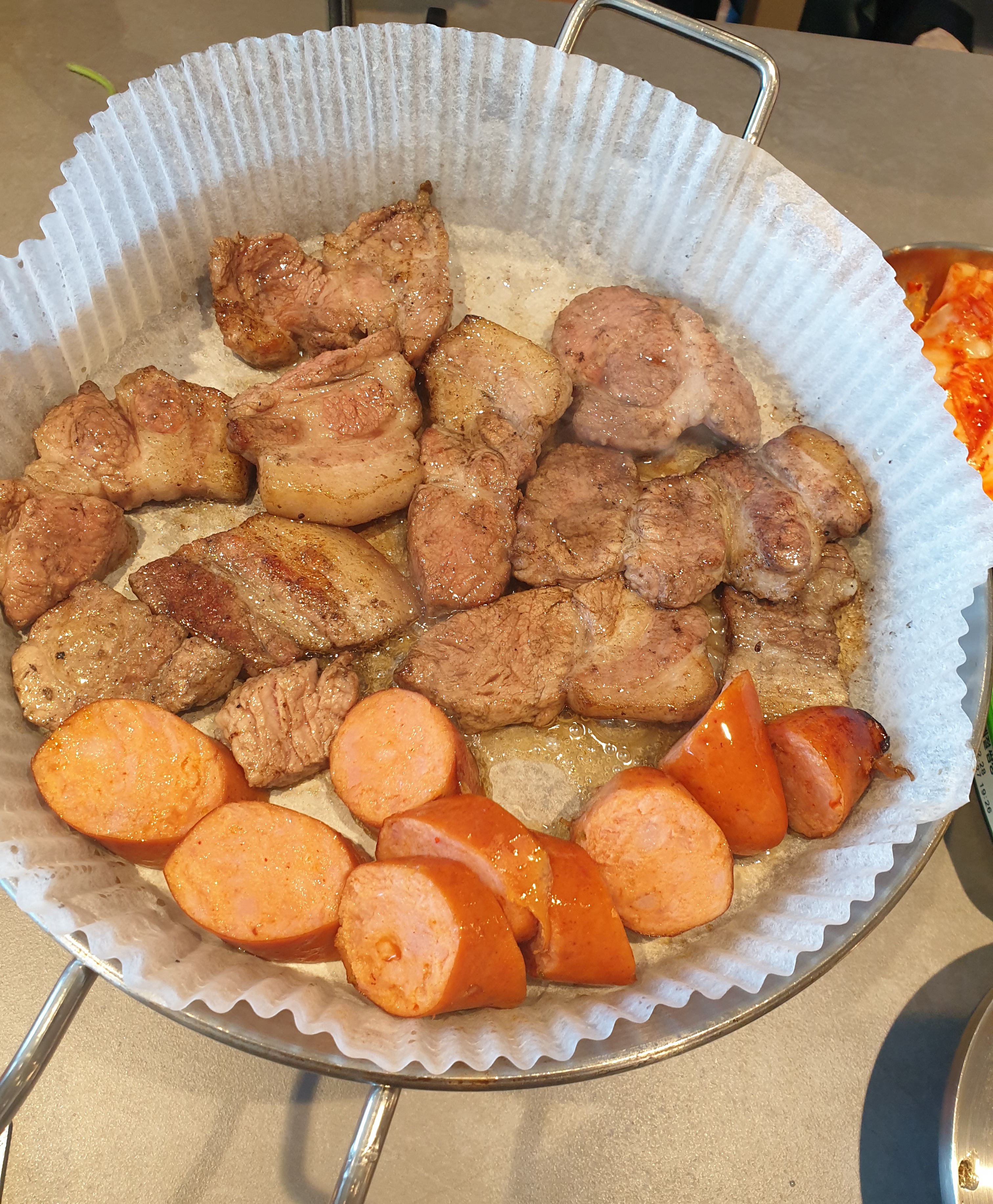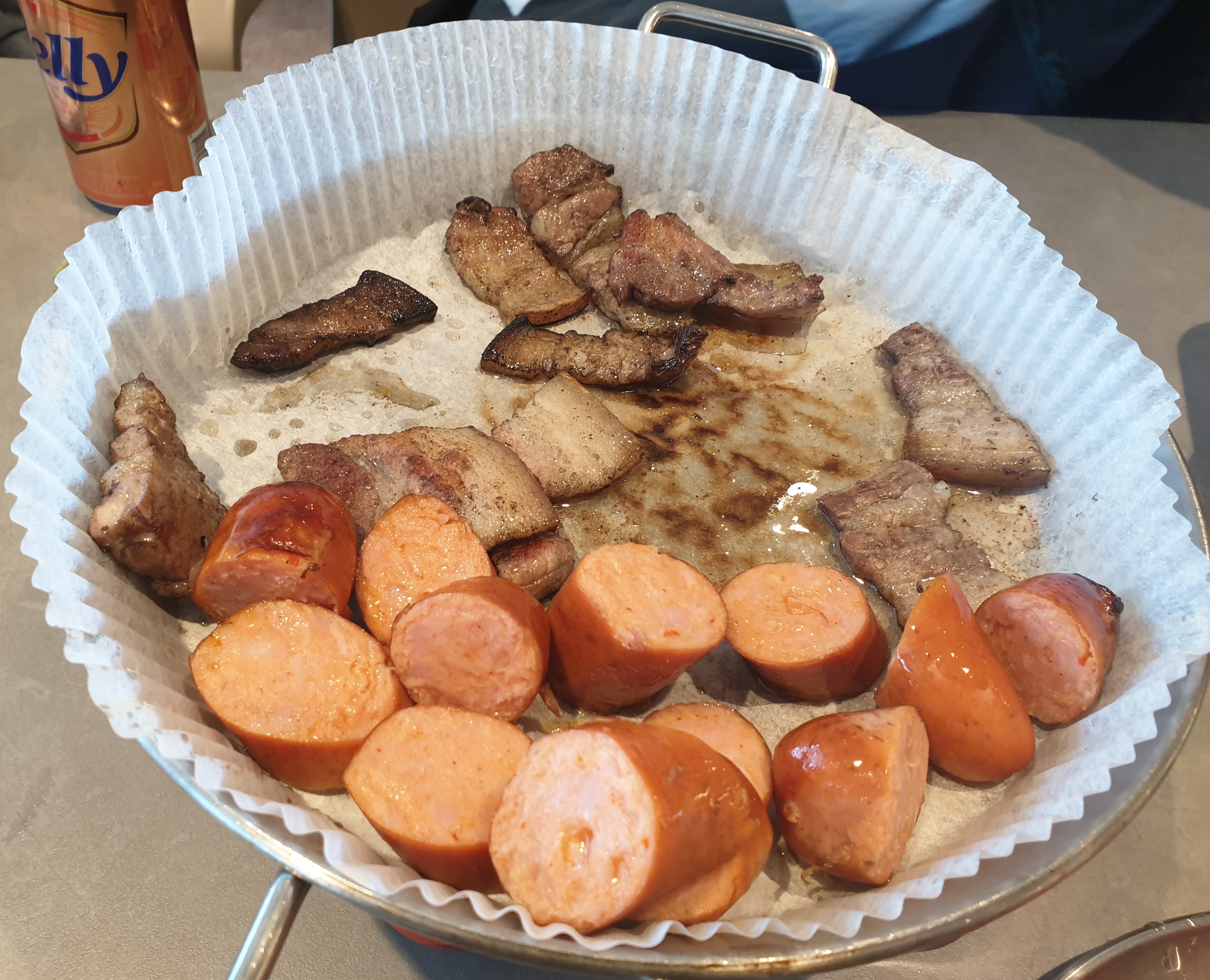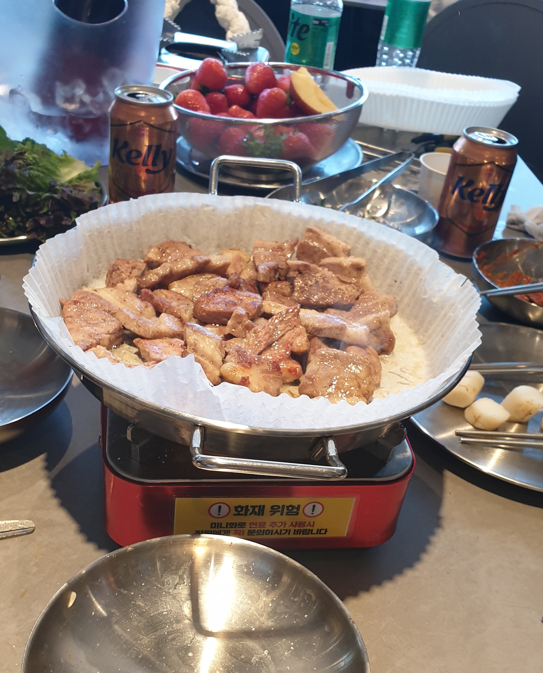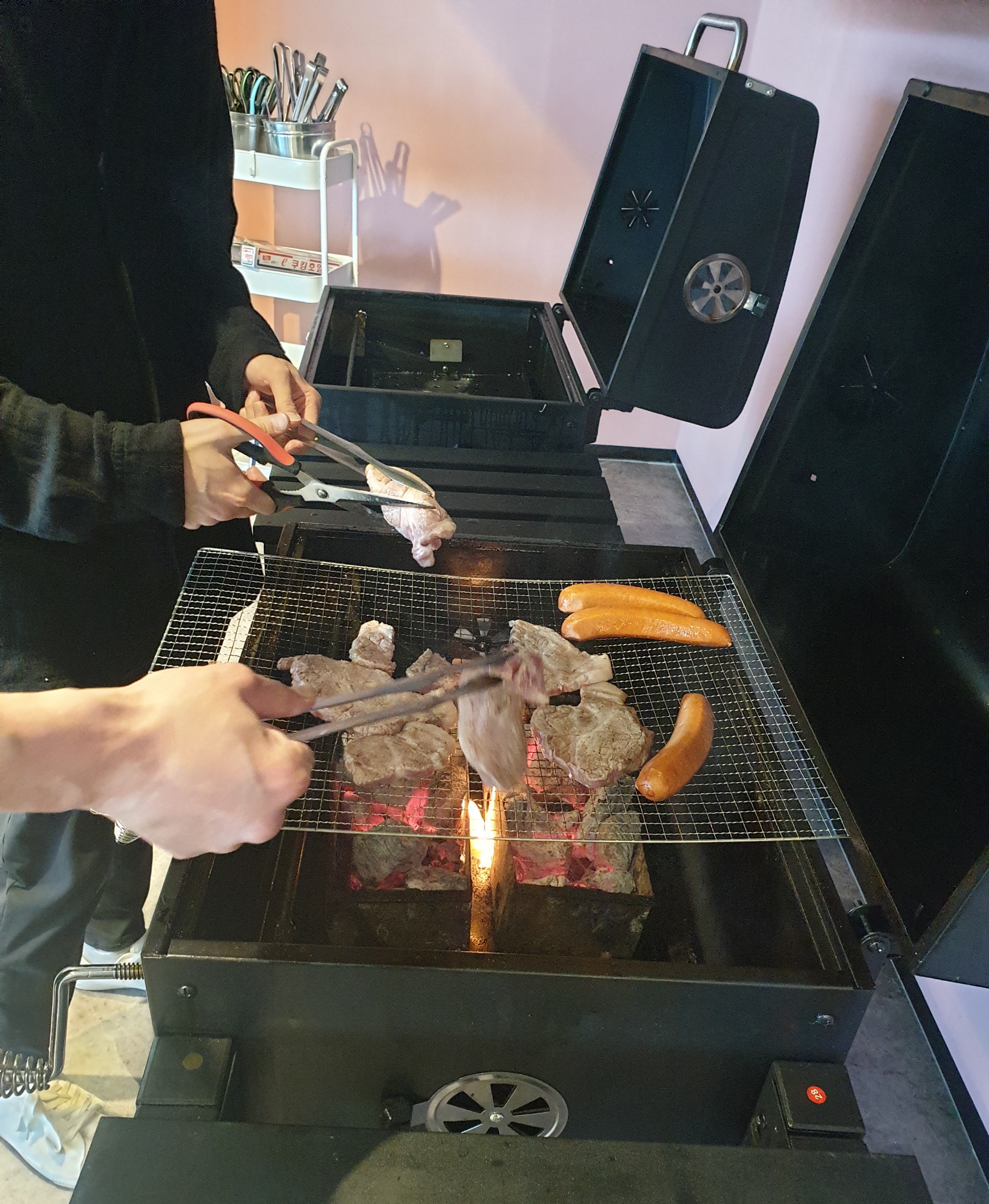 구매한 고기와 소시지 등을 화로 숯불에서 초벌 구이를 한 후, 테이블에서 알콜램프를 이용해 조금 더 익혀 먹는 형식으로 했는데, 삼겹살 등 고기의 기름기가 1차 초벌구이 때 쫙 빠지면서 숯불향은 배여, 집에서 프라이팬에 구워 먹는 것보다 훨씬 더 담백하고 깔끔한 맛을 즐길 수 있었다.